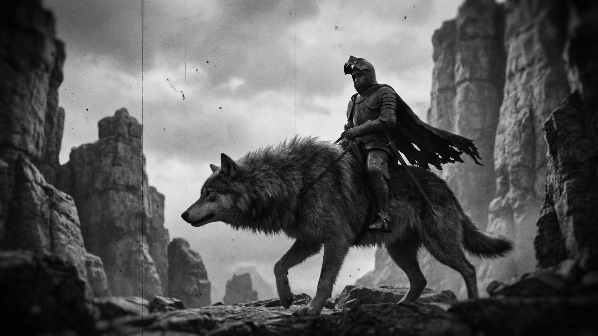 A powerful knight in full armor with the helmet open and a flowing cloak riding a giant wolf through a dramatic grey and brown rocky mountain landscape. The wolf walks with its body moving from right to left, with the wolf’s nose pointing toward the left edge of the image. Jagged rocks and cliffs surround them. The full body and head of both the knight and the wolf must be fully visible and not cropped. In the style of a 1920s silent film, black and white, heavy grain, high contrast, degraded film quality, visible scratches and damage, lower clarity, authentic aged cinema. No text on the image. The image covers the whole frame