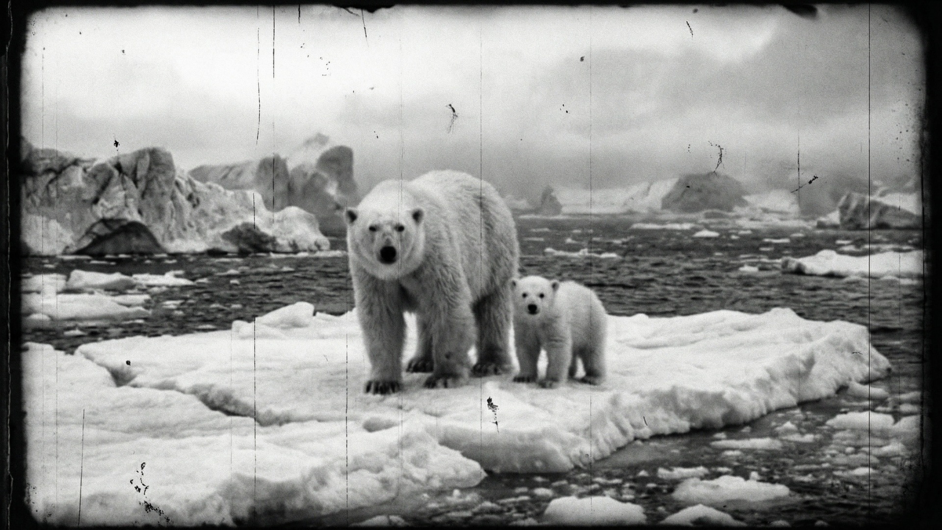 A large polar bear and her small cub standing side by side on a floating ice floe in the Arctic ocean, both fully visible and facing the camera. Icebergs and icy water stretch into the distance behind them under a bright clear Arctic blue sky. In the style of a 1920s silent film, black and white, heavy grain, high contrast, degraded film quality, visible scratches and damage, lower clarity, authentic aged cinema. No text on the image. The image covers the whole frame