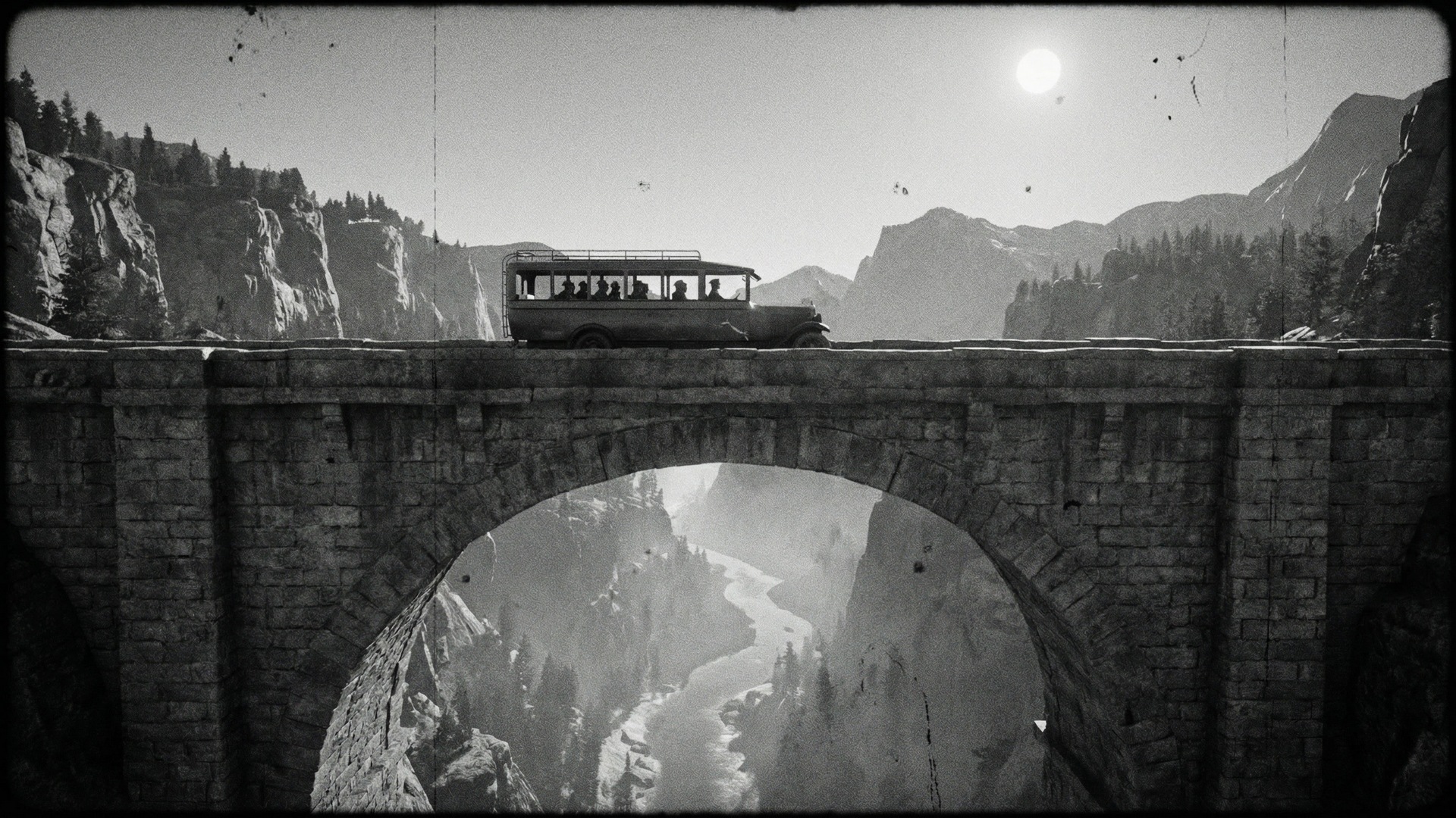 A bus seen from the side crossing a tall arched stone bridge spanning a dramatic gorge. The bus is driving across the bridge from left to right. The bridge is made of ancient grey stone with a large arch. Far below the bridge is a deep misty river valley. Forested mountains and cliffs rise in the distance. The scene shows the full bus and bridge clearly. Clear blue sky with the sun fully visible in the distance. In the style of a 1920s silent film, black and white, heavy grain, high contrast, degraded film quality, visible scratches and damage, lower clarity, authentic aged cinema. No text on the image. The image covers the whole frame