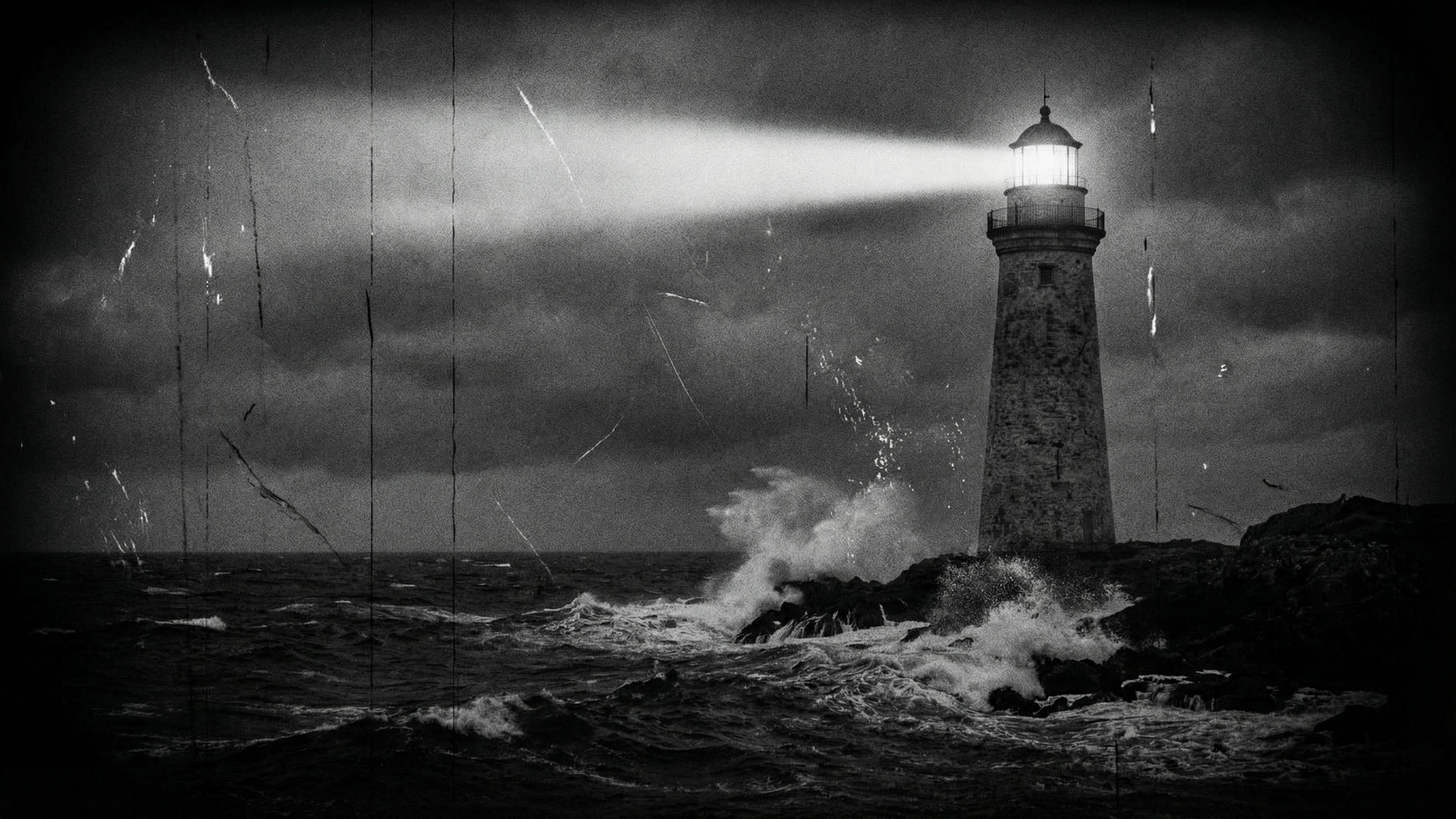 A solitary lighthouse standing on a rocky island at night, waves crashing violently against the rocks below. Dark stormy clouds fill the sky above. The lighthouse beam cuts through the darkness. In the style of a 1920s silent film, black and white, heavy grain, high contrast, degraded film quality, visible scratches and damage, lower clarity, authentic aged cinema. No text on the image. The image covers the whole frame