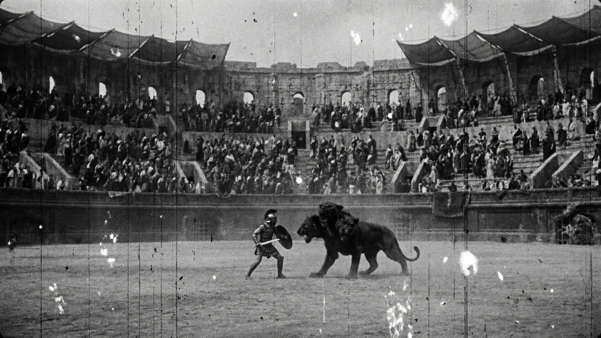 A vast ancient outdoors Roman colosseum arena with a gladiator warrior fighting a massive two-headed monster in the center. Crowds of spectators in traditional Roman tunics and togas seated in the grandstands surrounding the arena. There are no people on the arena floor. Dark dramatic, overcast sky above. In the style of a 1920s silent film, black and white, heavy grain, high contrast, degraded film quality, visible scratches and damage, lower clarity, authentic aged cinema. No text on the image. The image covers the whole frame