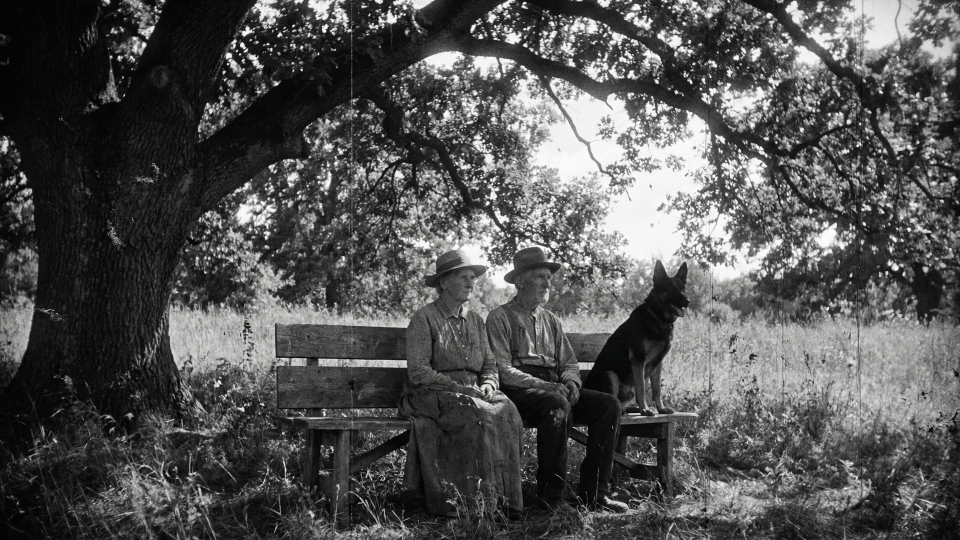 An elderly couple in their 80s sitting closely together on an old wooden bench in a lush green summer field on a bright sunny day. A German Shepherd dog sits upright on the bench beside them. They are sitting under the wide spreading canopy of a large oak tree in full summer leaf, with thick green foliage overhead and blue sky visible through the branches. Both facing the camera. In the style of a 1920s silent film, black and white, heavy grain, high contrast, degraded film quality, visible scratches and damage, lower clarity, authentic aged cinema. No text on the image. The image covers the whole frame