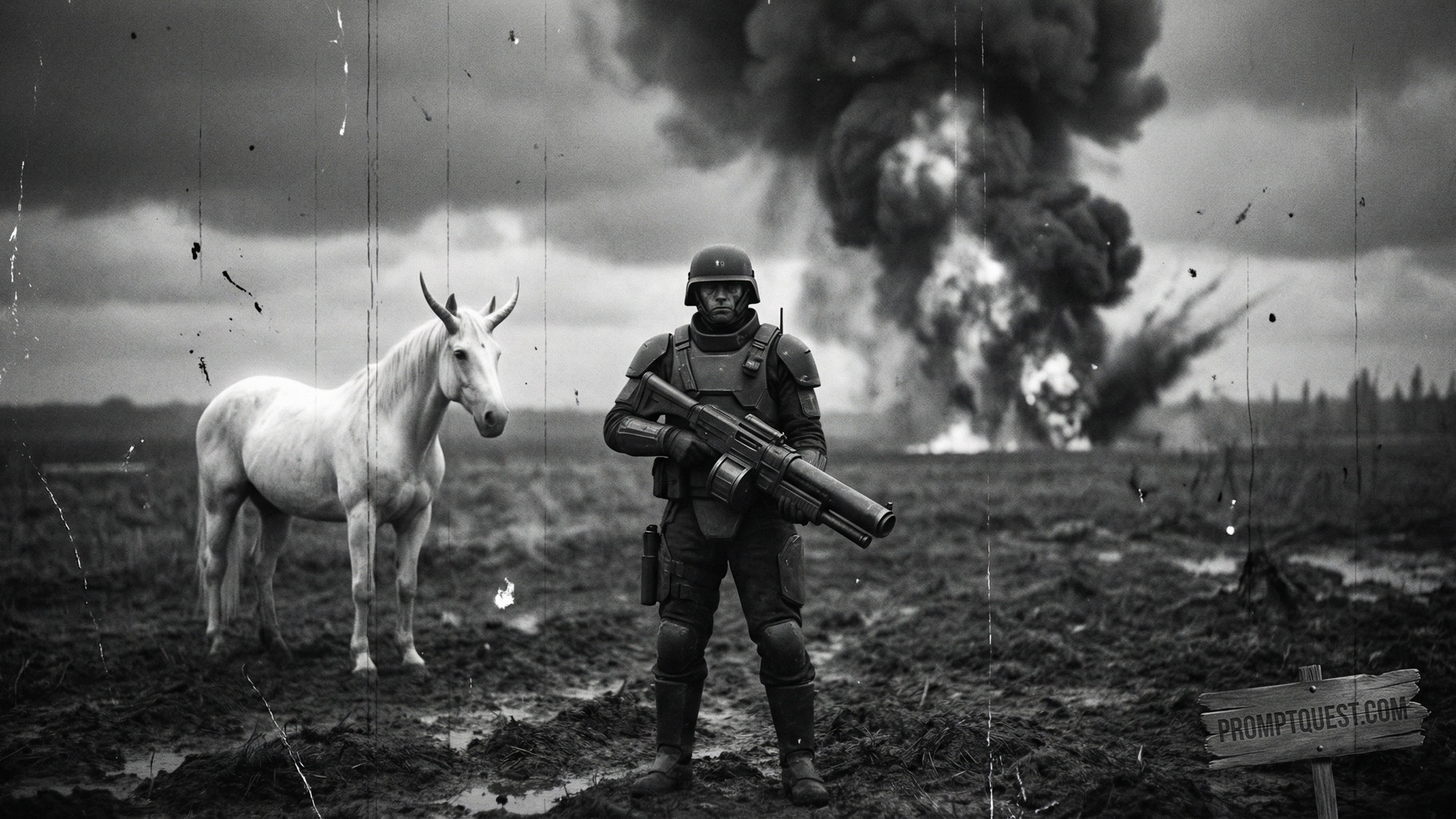 A lone soldier in black futuristic combat gear holding a machine gun, standing centered in the frame in an open muddy warzone. A clean white unicorn stands calmly beside him. Thick smoke and dust fill the air around them. A large explosion erupts directly behind him with fire rising into a dark dramatic smoky sky. The soldier faces the camera. In the style of a 1920s silent film, black and white, heavy grain, high contrast, degraded film quality, visible scratches and damage, lower clarity, authentic aged cinema. No text on the image. The image covers the whole frame