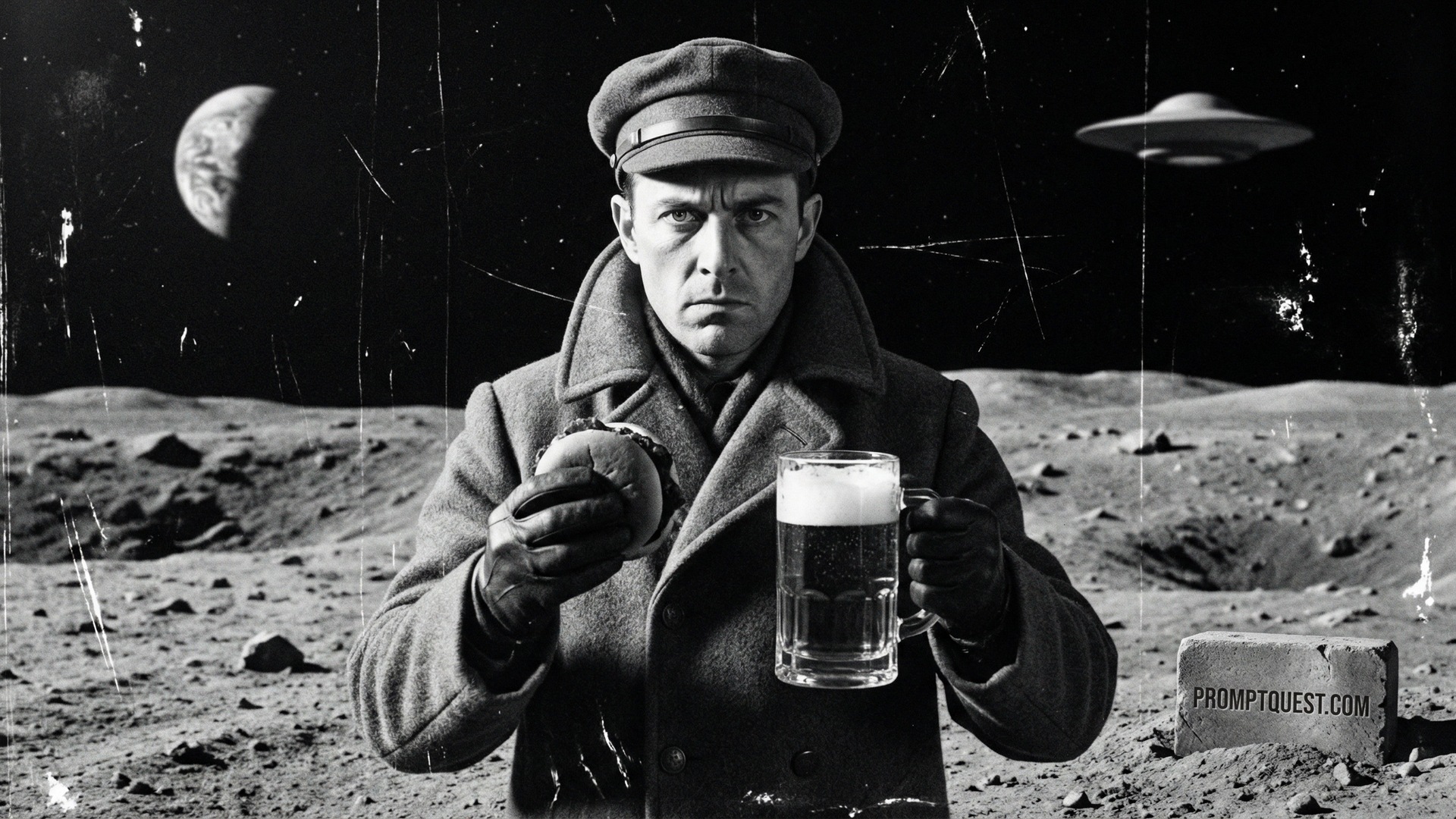 A portrait of a middle aged man in his 40s with a serious and intense expression, looking directly into the camera, holding a hamburger in one hand and a large glass mug of foaming beer in the other. Full head and shoulders centered in the frame. Standing on the moon, surrounded by a dramatic rocky lunar landscape stretching out in all directions, Earth visible in the sky on the left side and an alien spaceship hovering in the sky on the right side. In the style of a 1920s silent film, black and white, heavy grain, high contrast, degraded film quality, visible scratches and damage, lower clarity, authentic aged cinema. No text on the image. The image covers the whole frame
