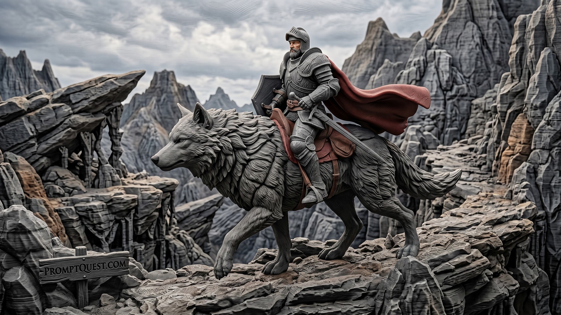 In the style of 3D printed. All characters and elements must be in the style of paper cutout. No frames around the picture. No borders around the picture. A powerful knight in full armor with the helmet open and a flowing cloak riding a giant wolf through a dramatic grey and brown rocky mountain landscape. The wolf walks with its body moving from right to left, with the wolf’s nose pointing toward the left edge of the image. Jagged rocks and cliffs surround them. The full body and head of both the knight and the wolf must be fully visible and not cropped