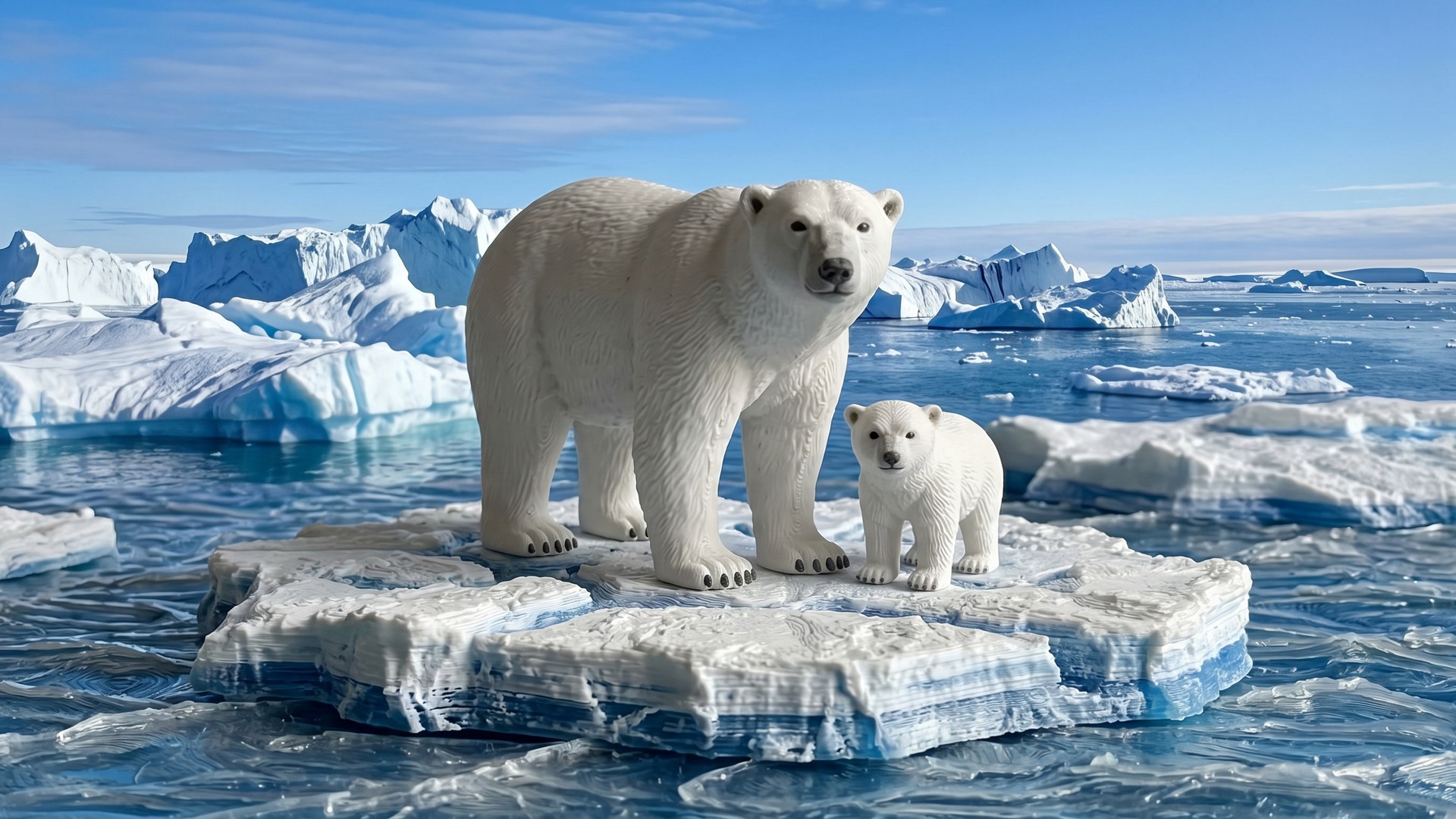 In the style of 3D printed. All characters and elements must be in the style of paper cutout. No frames around the picture. No borders around the picture. A large polar bear and her small cub standing side by side on a floating ice floe in the Arctic ocean, both fully visible and facing the camera. Icebergs and icy water stretch into the distance behind them under a bright clear Arctic blue sky