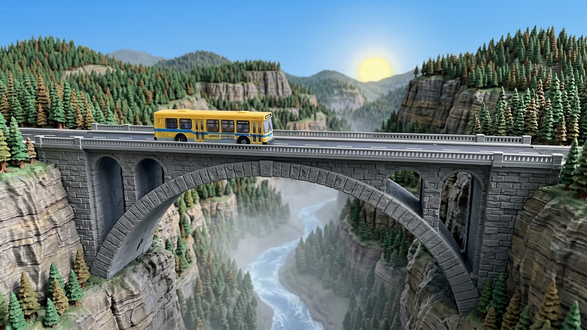 In the style of 3D printed. All characters and elements must be in the style of paper cutout. No frames around the picture. No borders around the picture. A bus seen from the side crossing a tall arched stone bridge spanning a dramatic gorge. The bus is driving across the bridge from left to right. The bridge is made of ancient grey stone with a large arch. Far below the bridge is a deep misty river valley. Forested mountains and cliffs rise in the distance. The scene shows the full bus and bridge clearly. Clear blue sky with the sun fully visible in the distance