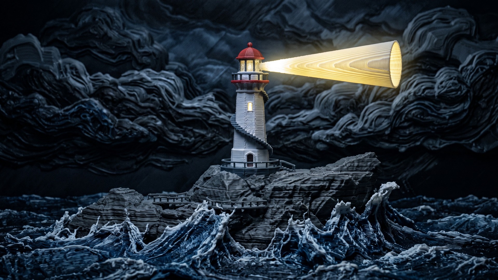 In the style of 3D printed. All characters and elements must be in the style of paper cutout. No frames around the picture. No borders around the picture. A solitary lighthouse standing on a rocky island at night, waves crashing violently against the rocks below. Dark stormy clouds fill the sky above. The lighthouse beam cuts through the darkness