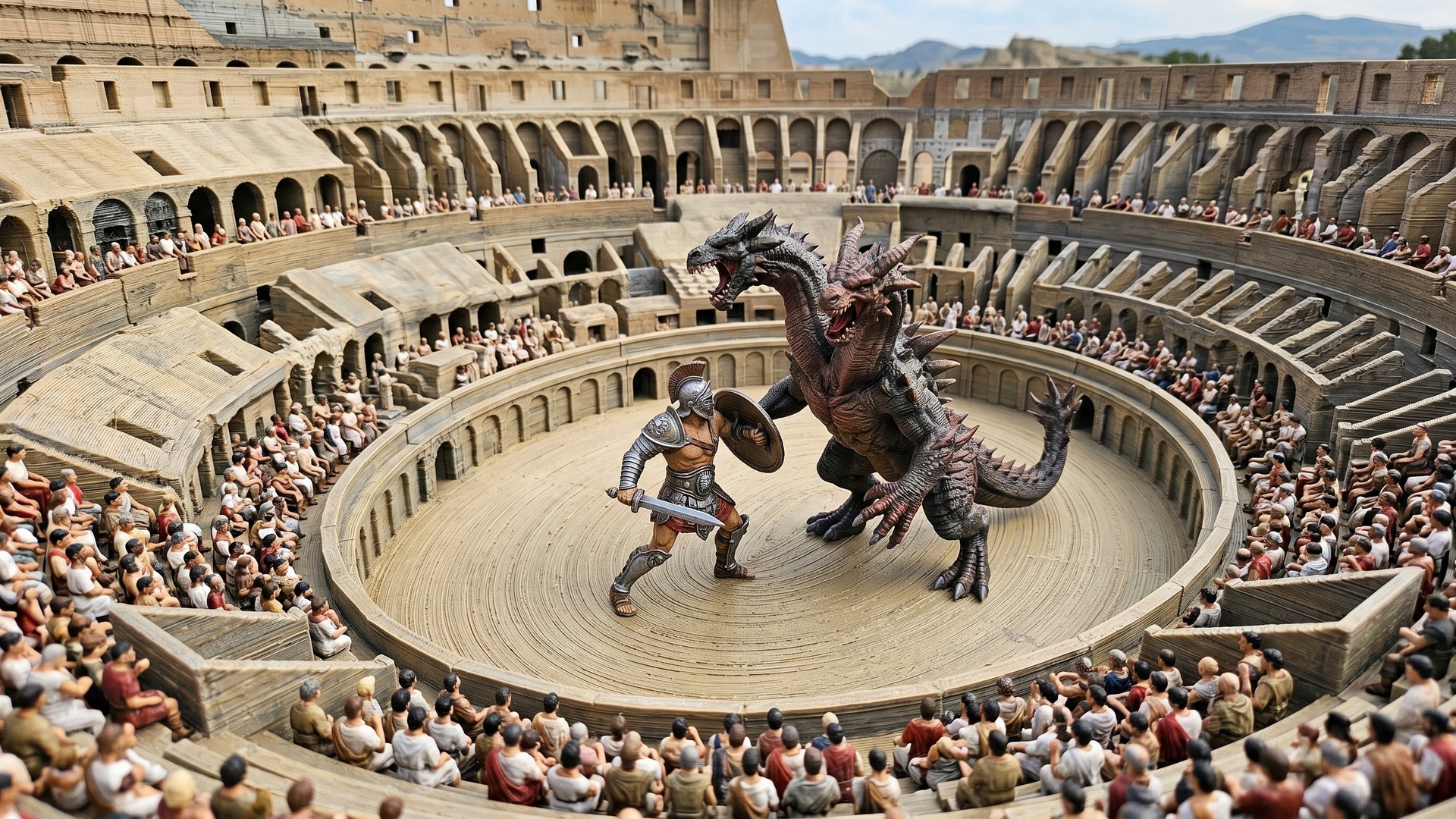 In the style of 3D printed. All characters and elements must be in the style of paper cutout. No frames around the picture. No borders around the picture. A vast ancient outdoors Roman colosseum arena with a gladiator warrior fighting a massive two-headed monster in the center. Crowds of spectators in traditional Roman tunics and togas seated in the grandstands surrounding the arena. There are no people on the arena floor. Dark dramatic, overcast sky above