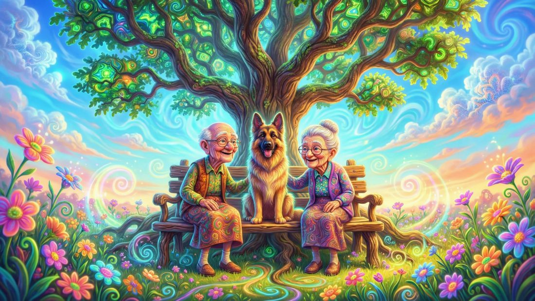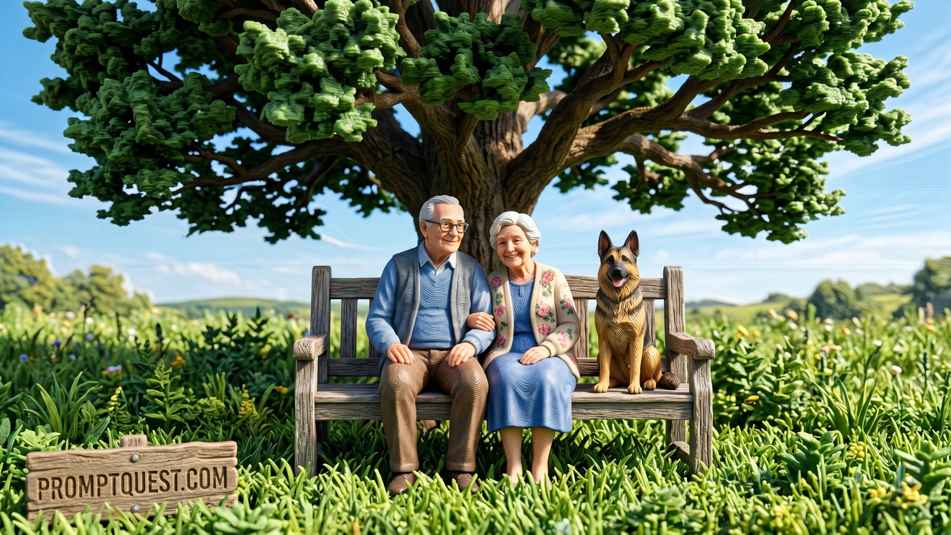 In the style of 3D printed. All characters and elements must be in the style of paper cutout. No frames around the picture. No borders around the picture. An elderly couple in their 80s sitting closely together on an old wooden bench in a lush green summer field on a bright sunny day. A German Shepherd dog sits upright on the bench beside them. They are sitting under the wide spreading canopy of a large oak tree in full summer leaf, with thick green foliage overhead and blue sky visible through the branches. Both facing the camera