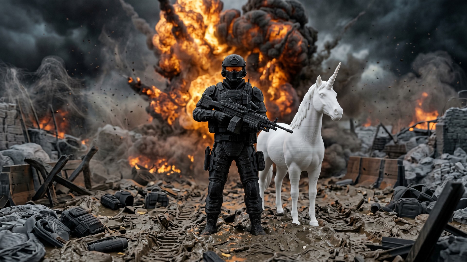 In the style of 3D printed. All characters and elements must be in the style of paper cutout. No frames around the picture. No borders around the picture. A lone soldier in black futuristic combat gear holding a machine gun, standing centered in the frame in an open muddy warzone. A clean white unicorn stands calmly beside him. Thick smoke and dust fill the air around them. A large explosion erupts directly behind him with fire rising into a dark dramatic smoky sky. The soldier faces the camera