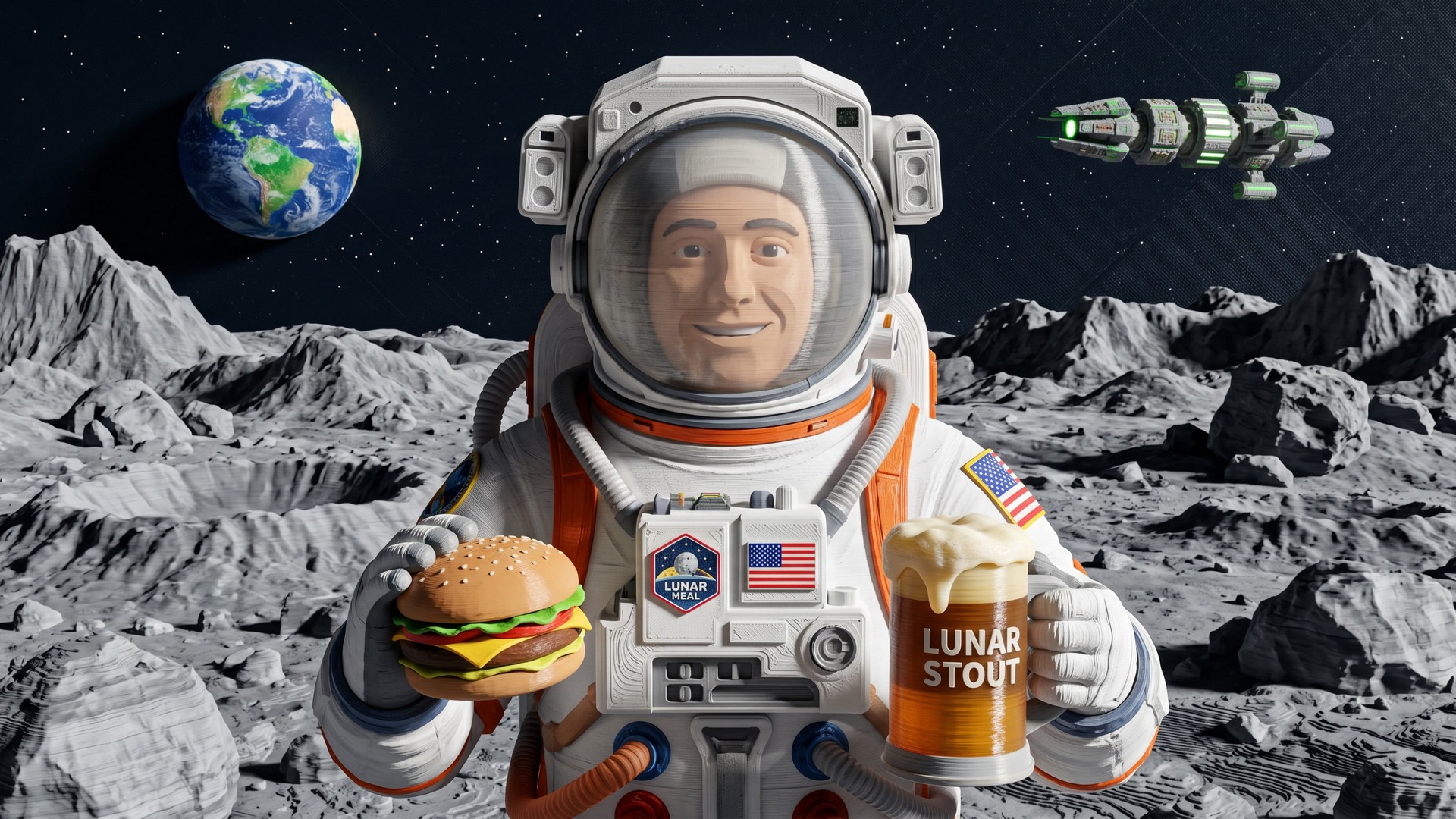 In the style of 3D printed. All characters and elements must be in the style of paper cutout. No frames around the picture. No borders around the picture. A portrait of a middle aged man in his 40s with a serious and intense expression, looking directly into the camera, holding a hamburger in one hand and a large glass mug of foaming beer in the other. Full head and shoulders centered in the frame. Standing on the moon, surrounded by a dramatic rocky lunar landscape stretching out in all directions, Earth visible in the sky on the left side and an alien spaceship hovering in the sky on the right side