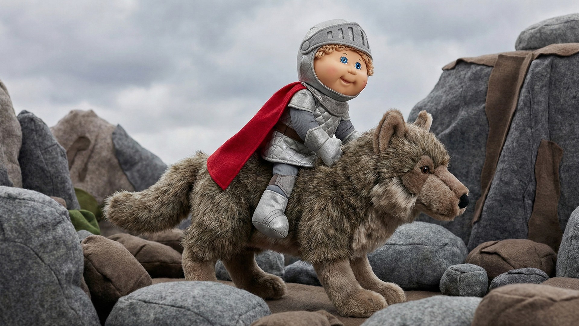 In the style of the Cabbage Patch Kids dolls. All characters and elements must be in the style of Cabbage Patch Kids dolls. A powerful knight in full armor with the helmet open and a flowing cloak riding a giant wolf through a dramatic grey and brown rocky mountain landscape. The wolf walks with its body moving from right to left, with the wolf’s nose pointing toward the left edge of the image. Jagged rocks and cliffs surround them. The full body and head of both the knight and the wolf must be fully visible and not cropped