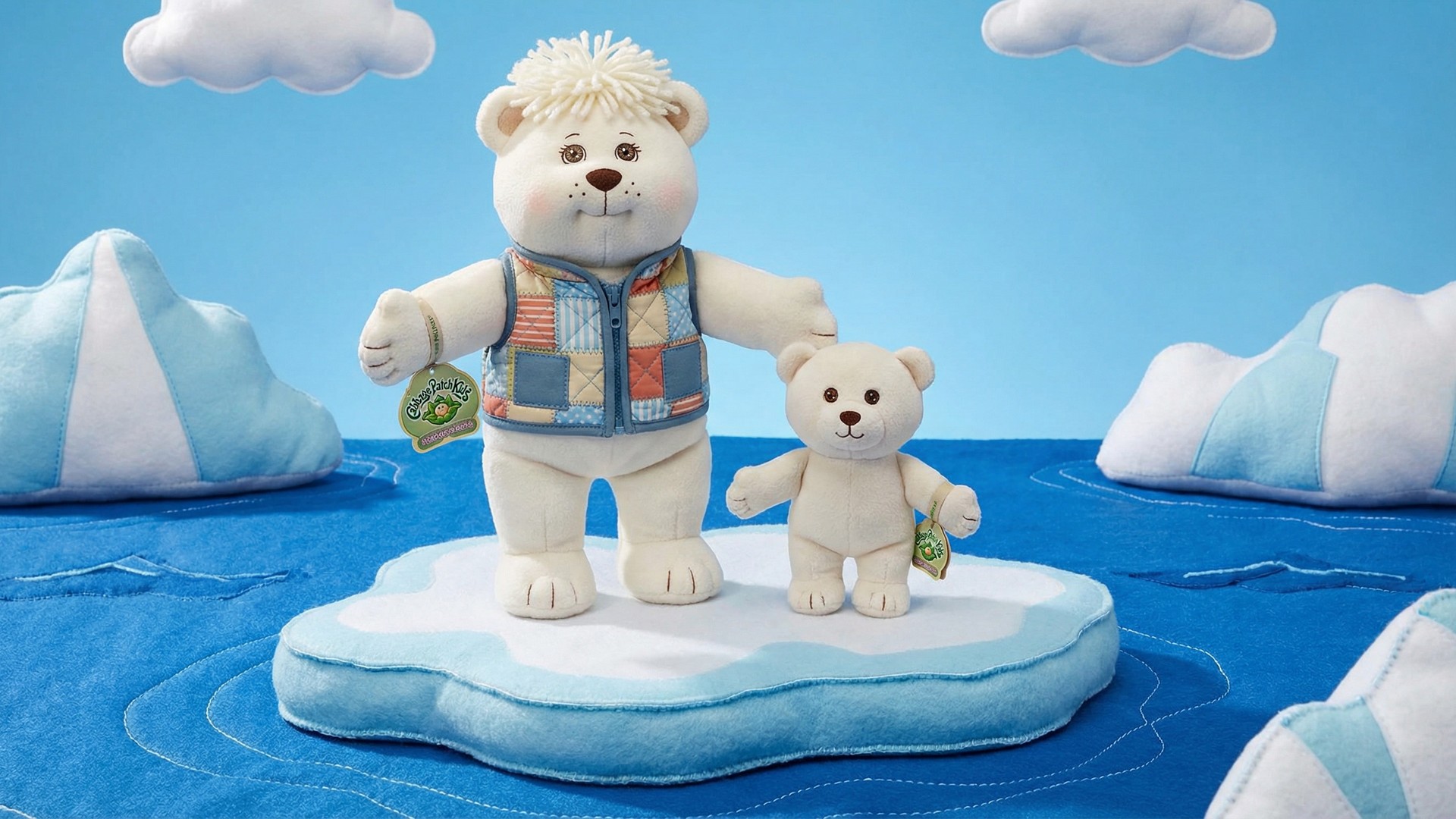In the style of the Cabbage Patch Kids dolls. All characters and elements must be in the style of Cabbage Patch Kids dolls. A large polar bear and her small cub standing side by side on a floating ice floe in the Arctic ocean, both fully visible and facing the camera. Icebergs and icy water stretch into the distance behind them under a bright clear Arctic blue sky