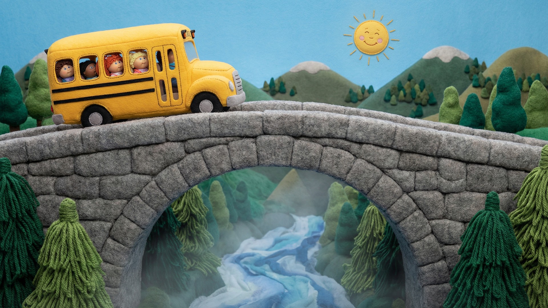 In the style of the Cabbage Patch Kids dolls. All characters and elements must be in the style of Cabbage Patch Kids dolls. A bus seen from the side crossing a tall arched stone bridge spanning a dramatic gorge. The bus is driving across the bridge from left to right. The bridge is made of ancient grey stone with a large arch. Far below the bridge is a deep misty river valley. Forested mountains and cliffs rise in the distance. The scene shows the full bus and bridge clearly. Clear blue sky with the sun fully visible in the distance