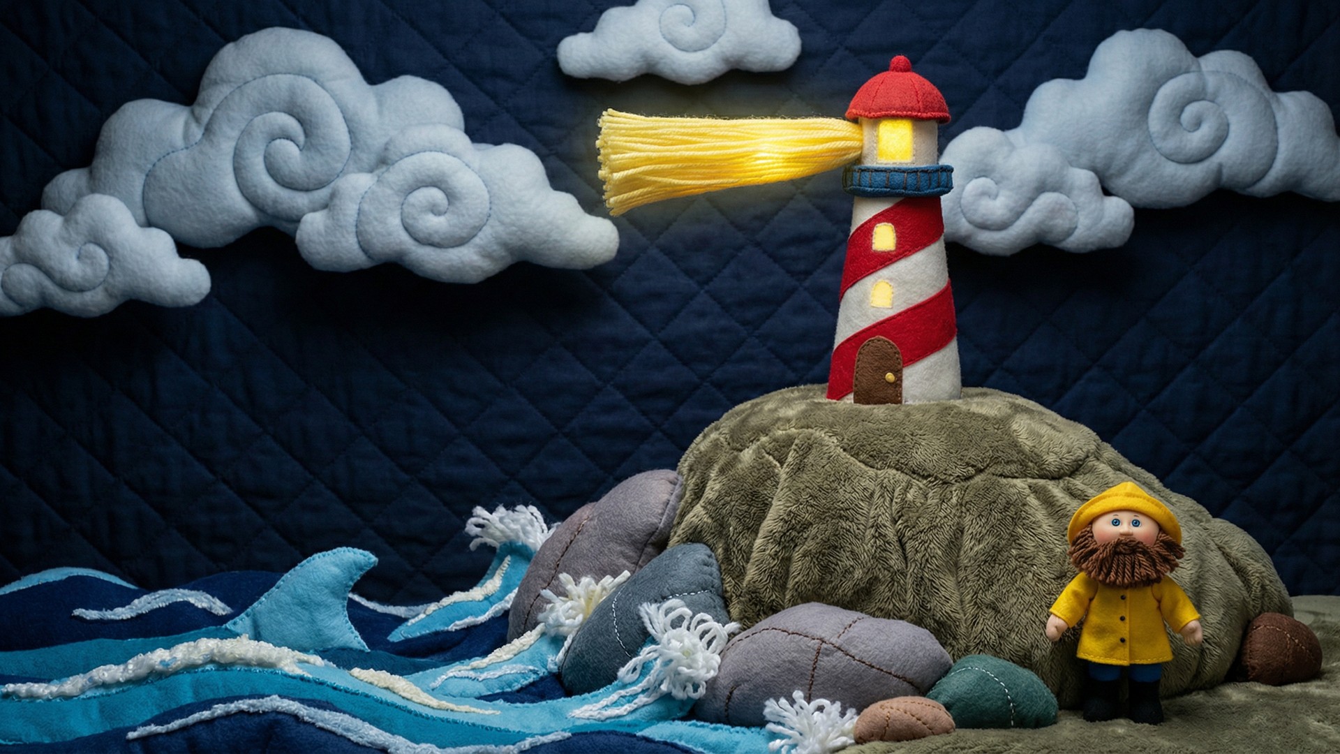 In the style of the Cabbage Patch Kids dolls. All characters and elements must be in the style of Cabbage Patch Kids dolls. A solitary lighthouse standing on a rocky island at night, waves crashing violently against the rocks below. Dark stormy clouds fill the sky above. The lighthouse beam cuts through the darkness