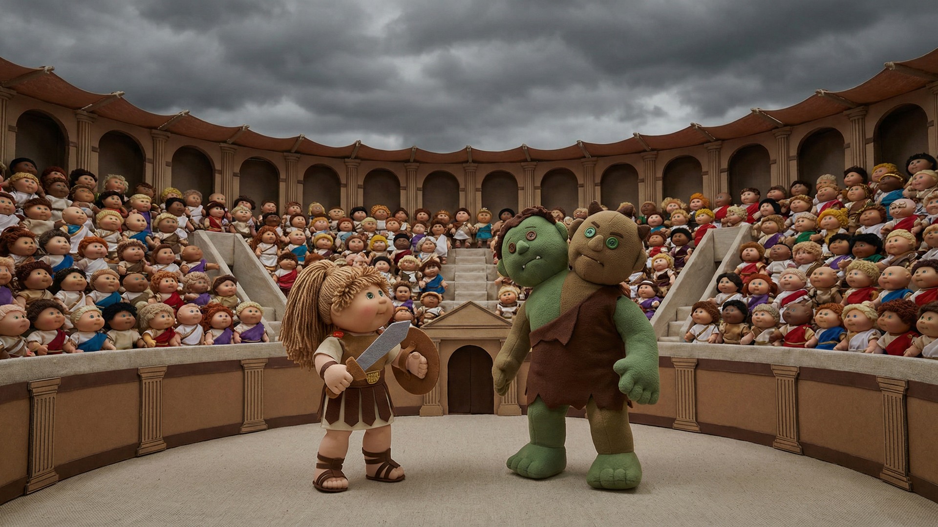 In the style of the Cabbage Patch Kids dolls. All characters and elements must be in the style of Cabbage Patch Kids dolls. A vast ancient outdoors Roman colosseum arena with a gladiator warrior fighting a massive two-headed monster in the center. Crowds of spectators in traditional Roman tunics and togas seated in the grandstands surrounding the arena. There are no people on the arena floor. Dark dramatic, overcast sky above