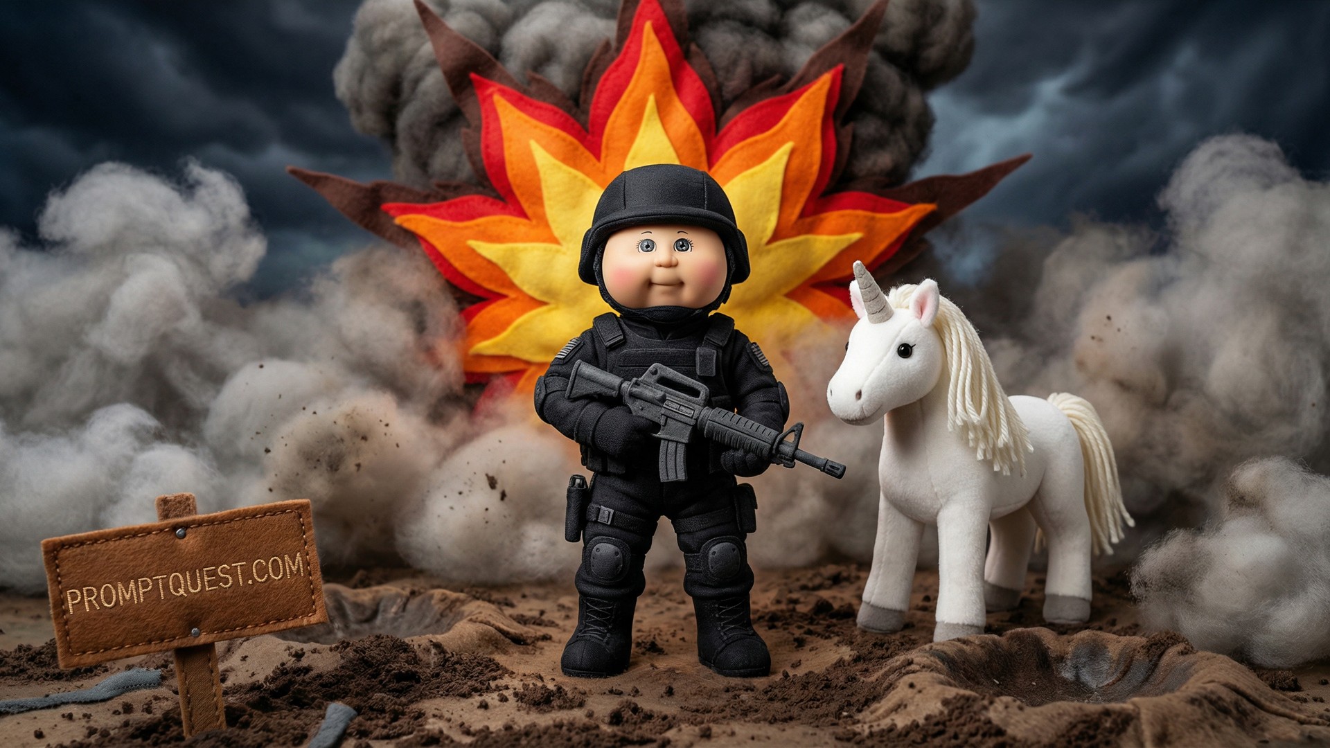 In the style of the Cabbage Patch Kids dolls. All characters and elements must be in the style of Cabbage Patch Kids dolls. A lone soldier in black futuristic combat gear holding a machine gun, standing centered in the frame in an open muddy warzone. A clean white unicorn stands calmly beside him. Thick smoke and dust fill the air around them. A large explosion erupts directly behind him with fire rising into a dark dramatic smoky sky. The soldier faces the camera