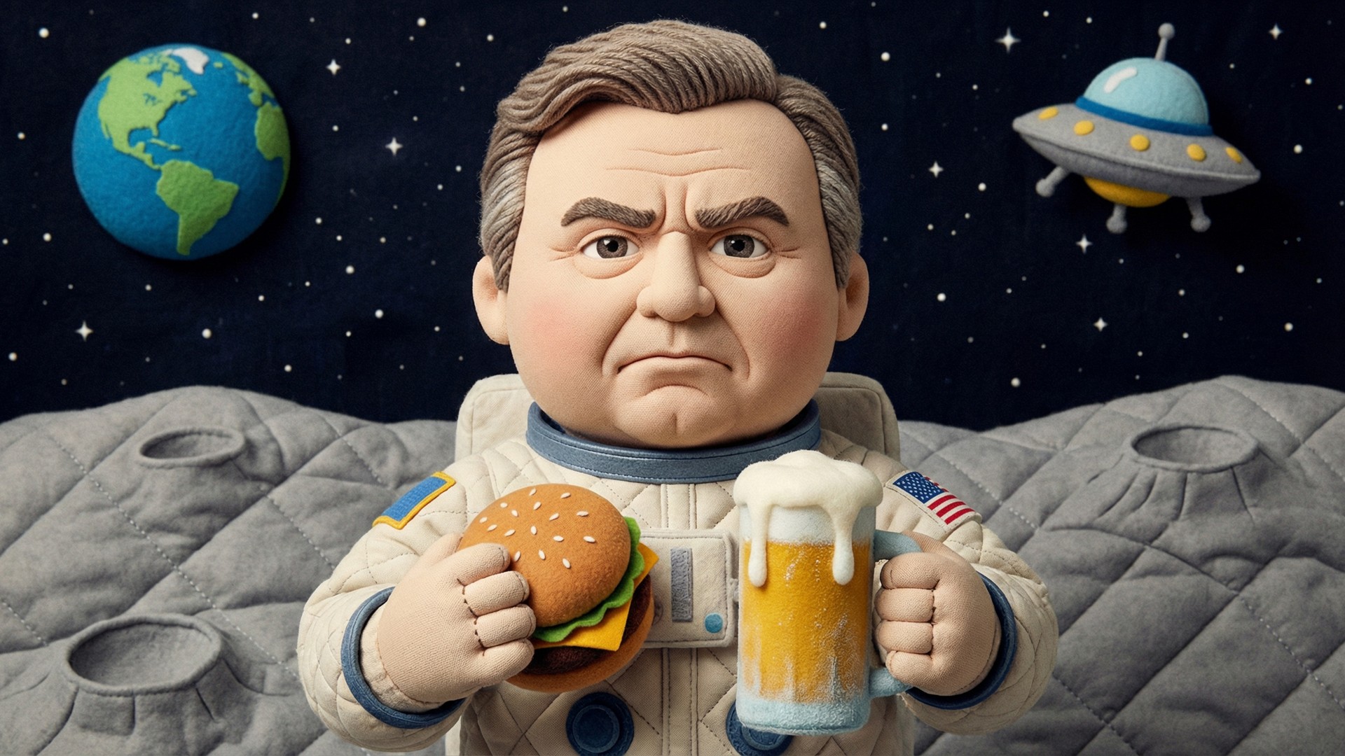 In the style of the Cabbage Patch Kids dolls. All characters and elements must be in the style of Cabbage Patch Kids dolls. A portrait of a middle aged man in his 40s with a serious and intense expression, looking directly into the camera, holding a hamburger in one hand and a large glass mug of foaming beer in the other. Full head and shoulders centered in the frame. Standing on the moon, surrounded by a dramatic rocky lunar landscape stretching out in all directions, Earth visible in the sky on the left side and an alien spaceship hovering in the sky on the right side