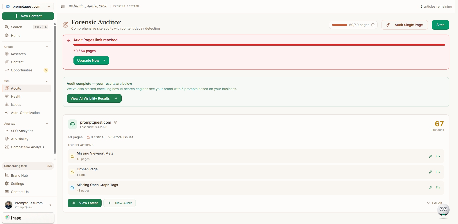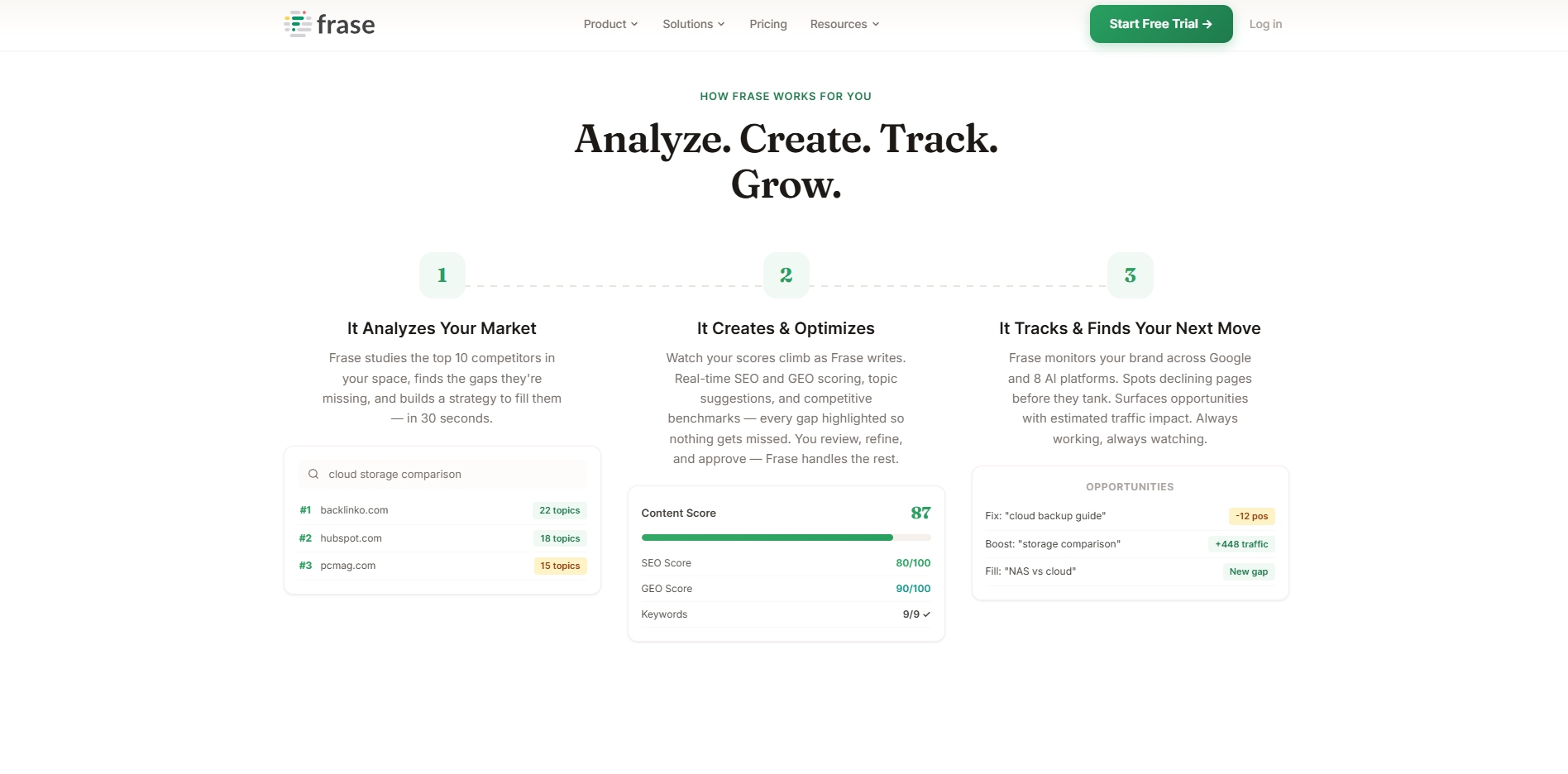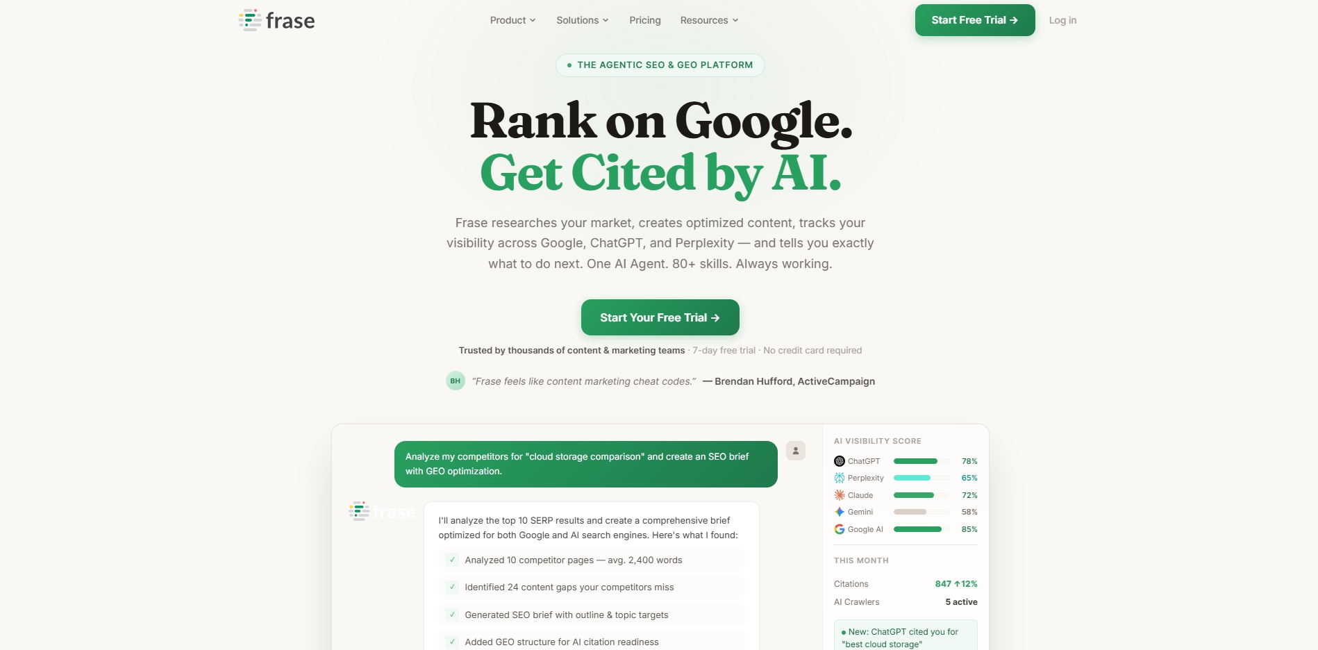 Frase is an AI-driven SEO and GEO platform built for content marketers, SEO teams, and agencies. You give it a target keyword and it crawls the top 20 Google results in seconds, pulling competitor outlines, common headings, questions from Reddit and Quora, and key topics your content needs to cover. From there it generates detailed content briefs and optimized drafts, with real-time scoring for both traditional SEO and AI visibility on how likely your content is to be cited by the commonly used AI platforms like ChatGPT, Claude AI, Google’s Gemini, and the answer engine Perplexity. Where Frase genuinely shines is the research and brief creation phase, which users consistently say saves two to three hours per article. The AI writer produces decent first drafts, but needs editing. It covers the right topics, but reads generically. A common complaint is that the real cost is higher than advertised since the Pro Add-on for unlimited AI writing costs an extra $35 per month on top of the base plan. Best for content teams producing five or more articles per month who want to speed up research without paying Surfer SEO prices