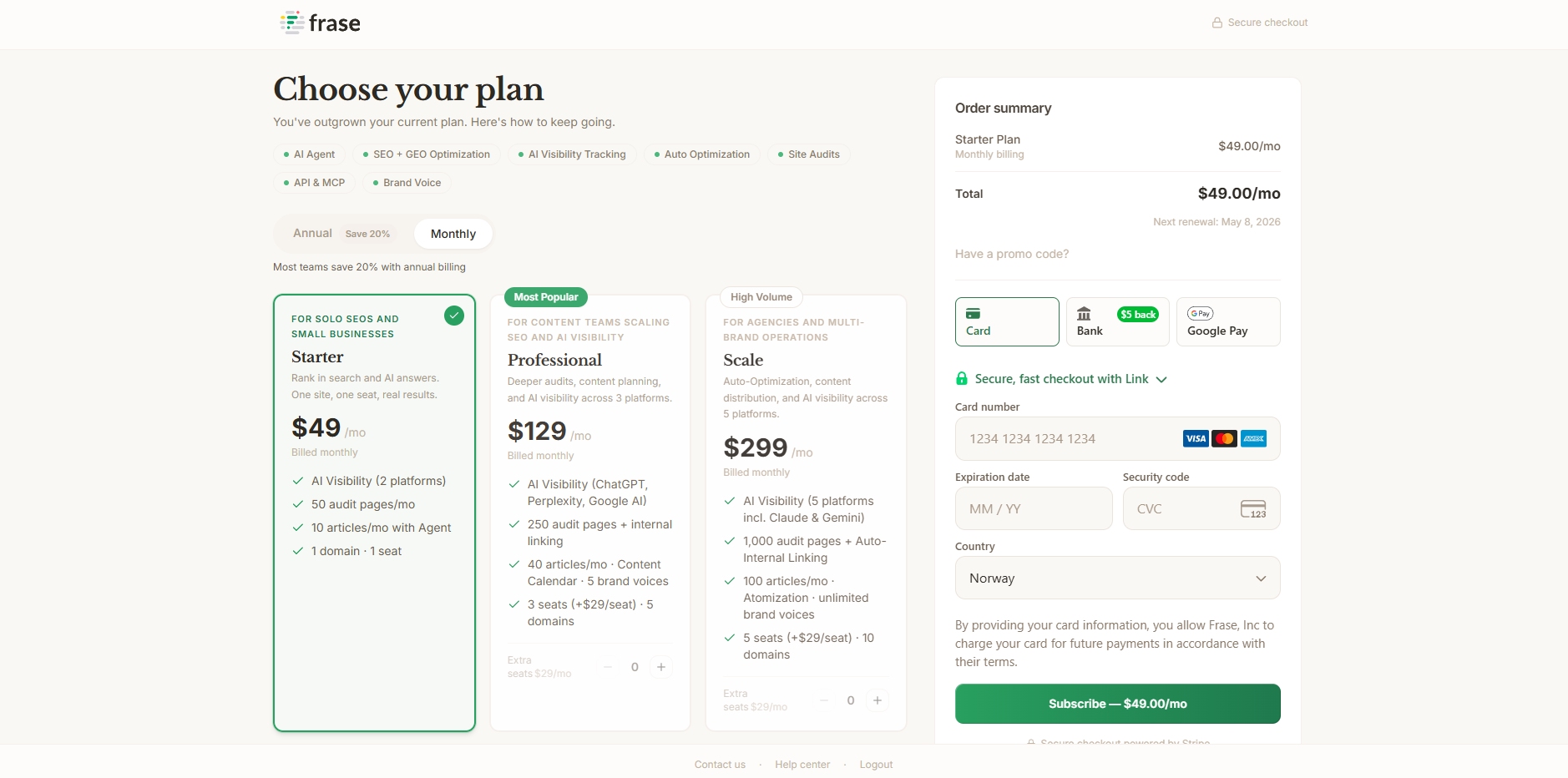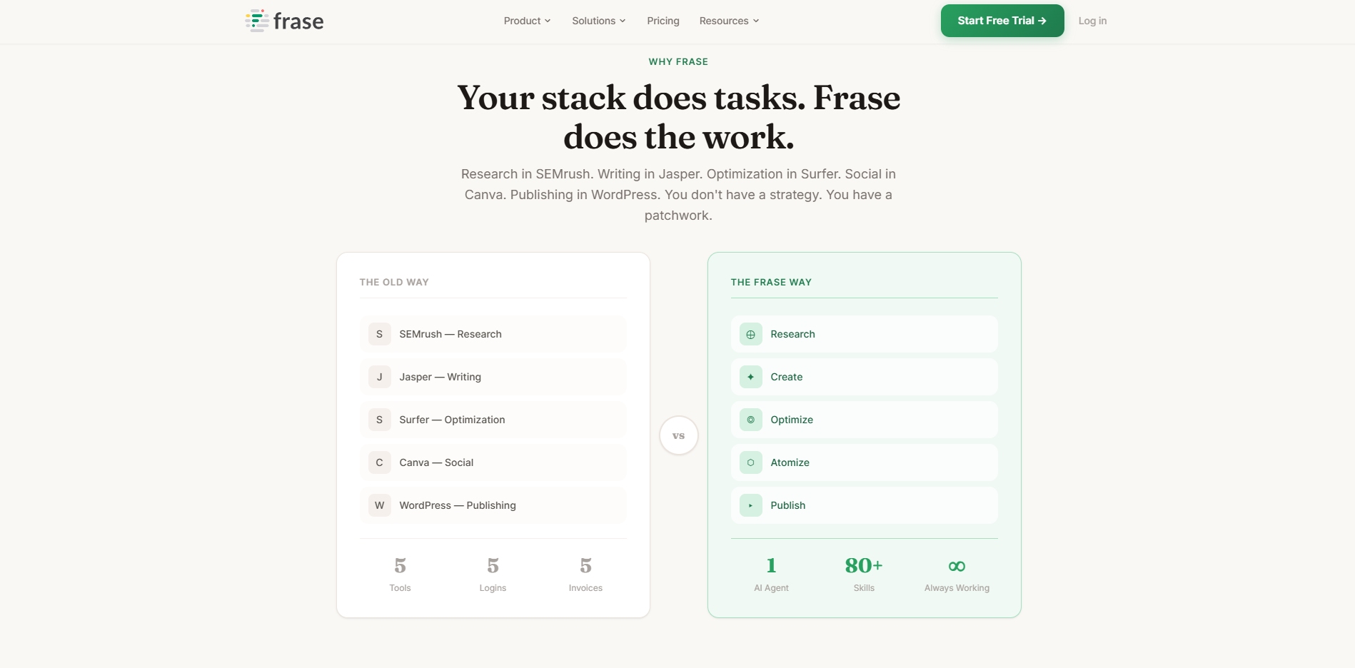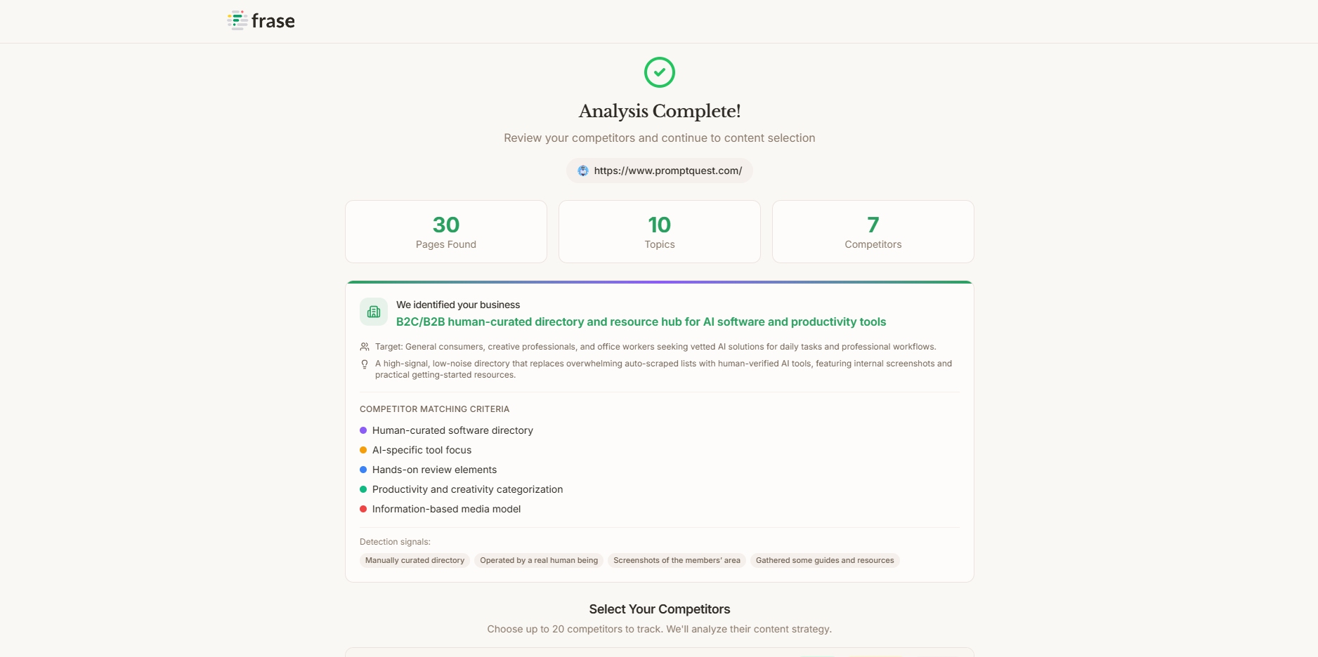 Frase is an AI-driven SEO and GEO platform built for content marketers, SEO teams, and agencies. You give it a target keyword and it crawls the top 20 Google results in seconds, pulling competitor outlines, common headings, questions from Reddit and Quora, and key topics your content needs to cover. From there it generates detailed content briefs and optimized drafts, with real-time scoring for both traditional SEO and AI visibility on how likely your content is to be cited by the commonly used AI platforms like ChatGPT, Claude AI, Google’s Gemini, and the answer engine Perplexity. Where Frase genuinely shines is the research and brief creation phase, which users consistently say saves two to three hours per article. The AI writer produces decent first drafts, but needs editing. It covers the right topics, but reads generically. A common complaint is that the real cost is higher than advertised since the Pro Add-on for unlimited AI writing costs an extra $35 per month on top of the base plan. Best for content teams producing five or more articles per month who want to speed up research without paying Surfer SEO prices