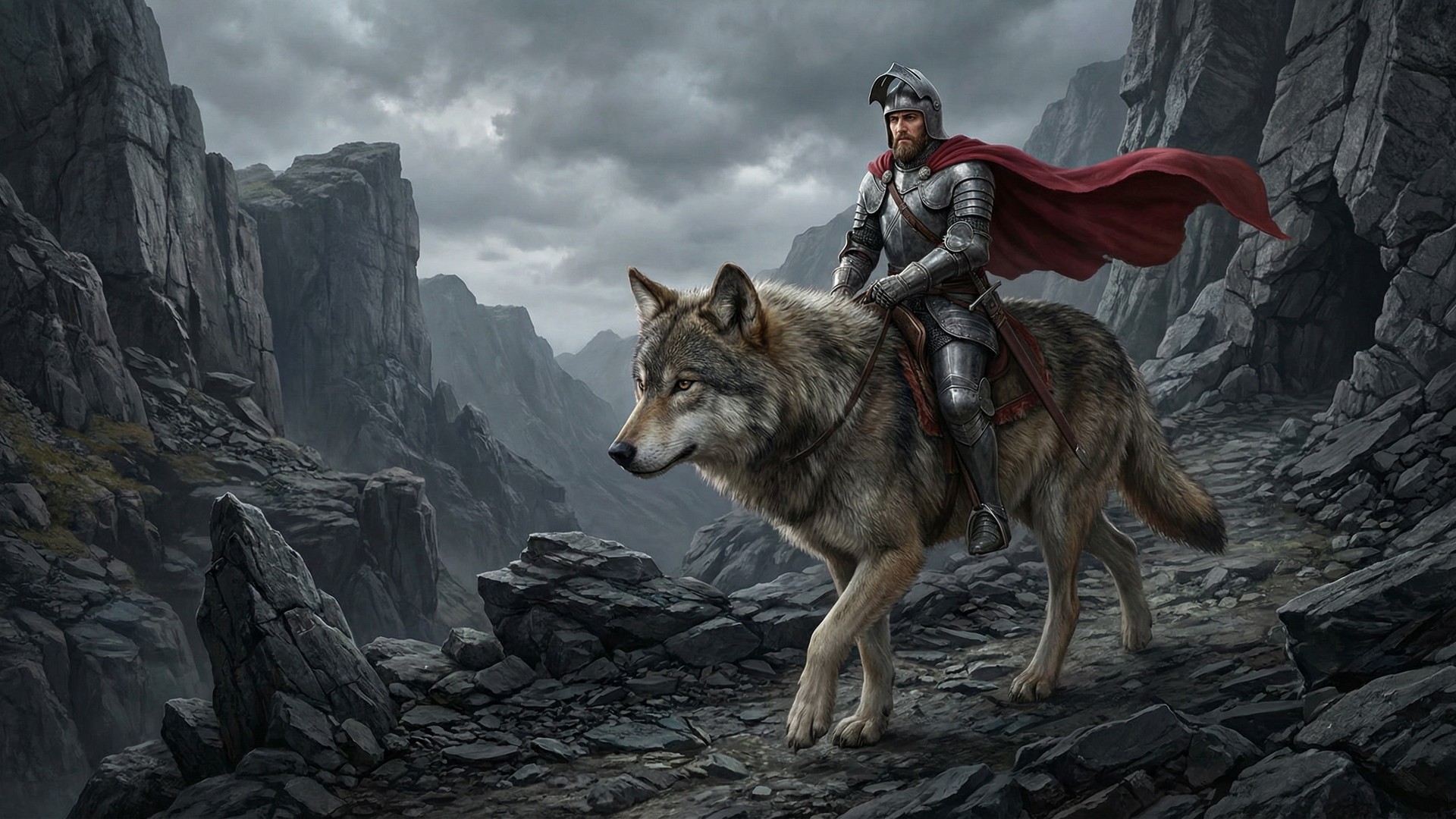 In the style of a hyperrealistic digital drawing. A powerful knight in full armor with the helmet open and a flowing cloak riding a giant wolf through a dramatic grey and brown rocky mountain landscape. The wolf walks with its body moving from right to left, with the wolf’s nose pointing toward the left edge of the image. Jagged rocks and cliffs surround them. The full body and head of both the knight and the wolf must be fully visible and not cropped