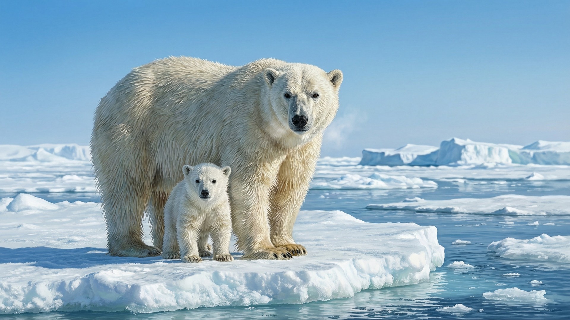 In the style of a hyperrealistic digital drawing. A large polar bear and her small cub standing side by side on a floating ice floe in the Arctic ocean, both fully visible and facing the camera. Icebergs and icy water stretch into the distance behind them under a bright clear Arctic blue sky