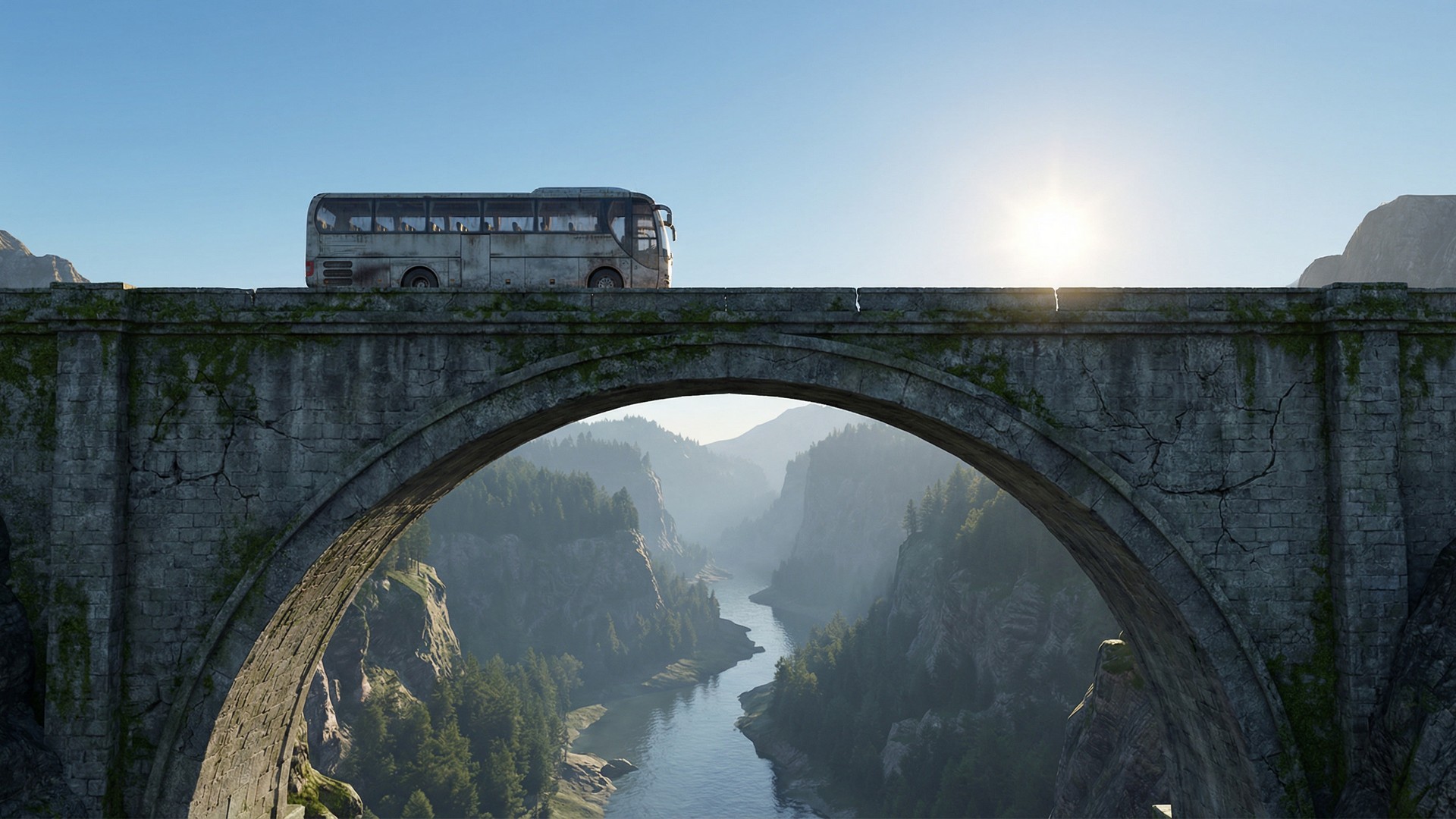 In the style of a hyperrealistic digital drawing. A bus seen from the side crossing a tall arched stone bridge spanning a dramatic gorge. The bus is driving across the bridge from left to right. The bridge is made of ancient grey stone with a large arch. Far below the bridge is a deep misty river valley. Forested mountains and cliffs rise in the distance. The scene shows the full bus and bridge clearly. Clear blue sky with the sun fully visible in the distance