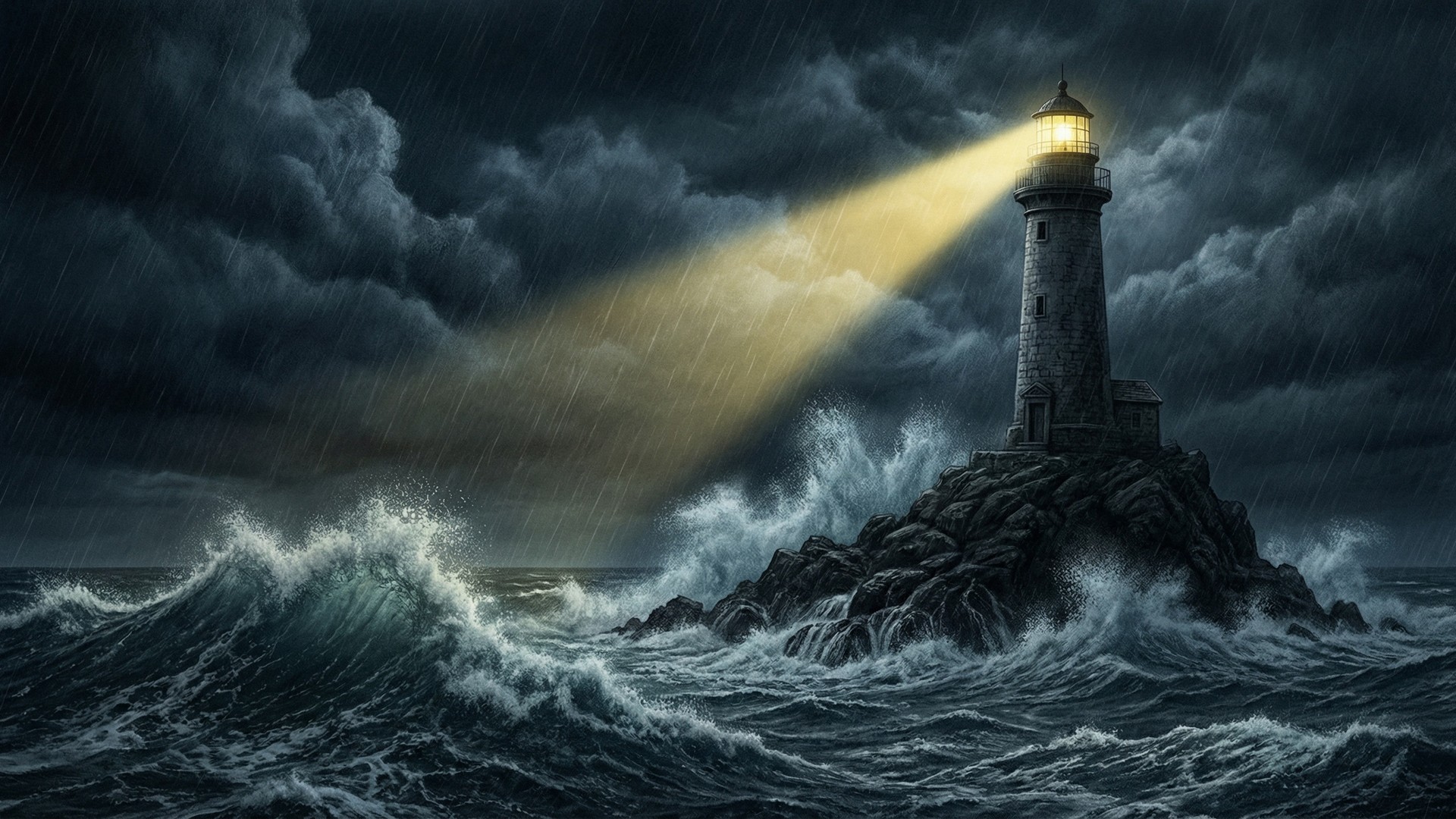 In the style of a hyperrealistic digital drawing. A solitary lighthouse standing on a rocky island at night, waves crashing violently against the rocks below. Dark stormy clouds fill the sky above. The lighthouse beam cuts through the darkness