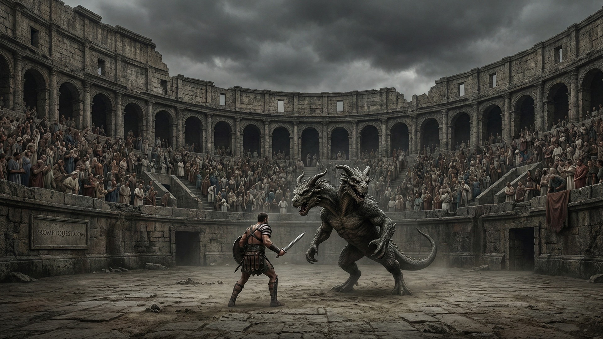 In the style of a hyperrealistic digital drawing. A vast ancient outdoors Roman colosseum arena with a gladiator warrior fighting a massive two-headed monster in the center. Crowds of spectators in traditional Roman tunics and togas seated in the grandstands surrounding the arena. There are no people on the arena floor. Dark dramatic, overcast sky above