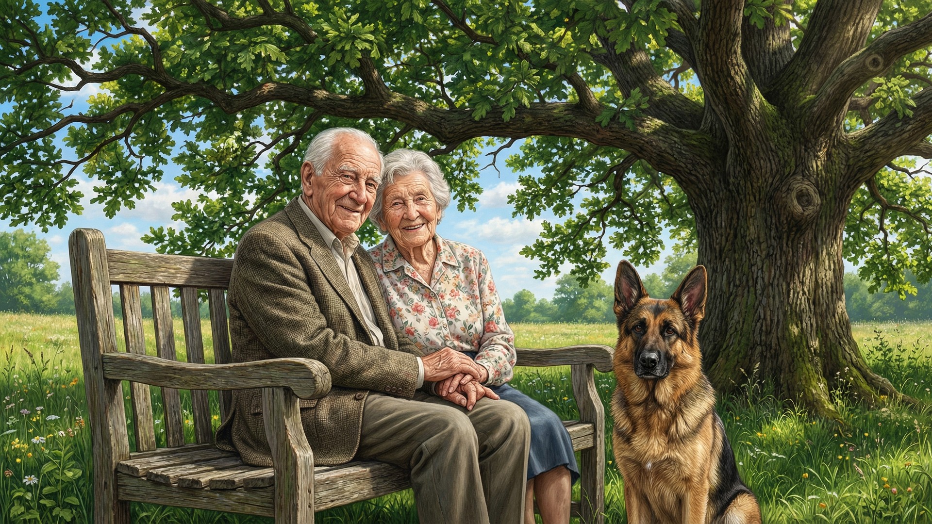 In the style of a hyperrealistic digital drawing. An elderly couple in their 80s sitting closely together on an old wooden bench in a lush green summer field on a bright sunny day. A German Shepherd dog sits upright on the bench beside them. They are sitting under the wide spreading canopy of a large oak tree in full summer leaf, with thick green foliage overhead and blue sky visible through the branches. Both facing the camera