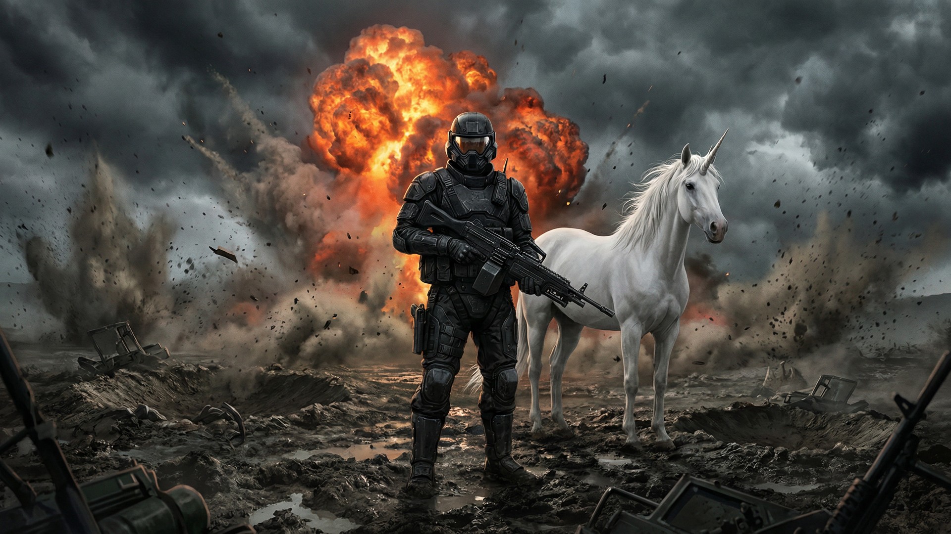 In the style of a hyperrealistic digital drawing. A lone soldier in black futuristic combat gear holding a machine gun, standing centered in the frame in an open muddy warzone. A clean white unicorn stands calmly beside him. Thick smoke and dust fill the air around them. A large explosion erupts directly behind him with fire rising into a dark dramatic smoky sky. The soldier faces the camera