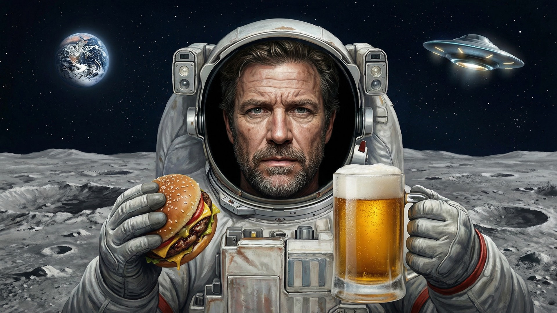 In the style of a hyperrealistic digital drawing. A portrait of a middle aged man in his 40s with a serious and intense expression, looking directly into the camera, holding a hamburger in one hand and a large glass mug of foaming beer in the other. Full head and shoulders centered in the frame. Standing on the moon, surrounded by a dramatic rocky lunar landscape stretching out in all directions, Earth visible in the sky on the left side and an alien spaceship hovering in the sky on the right side