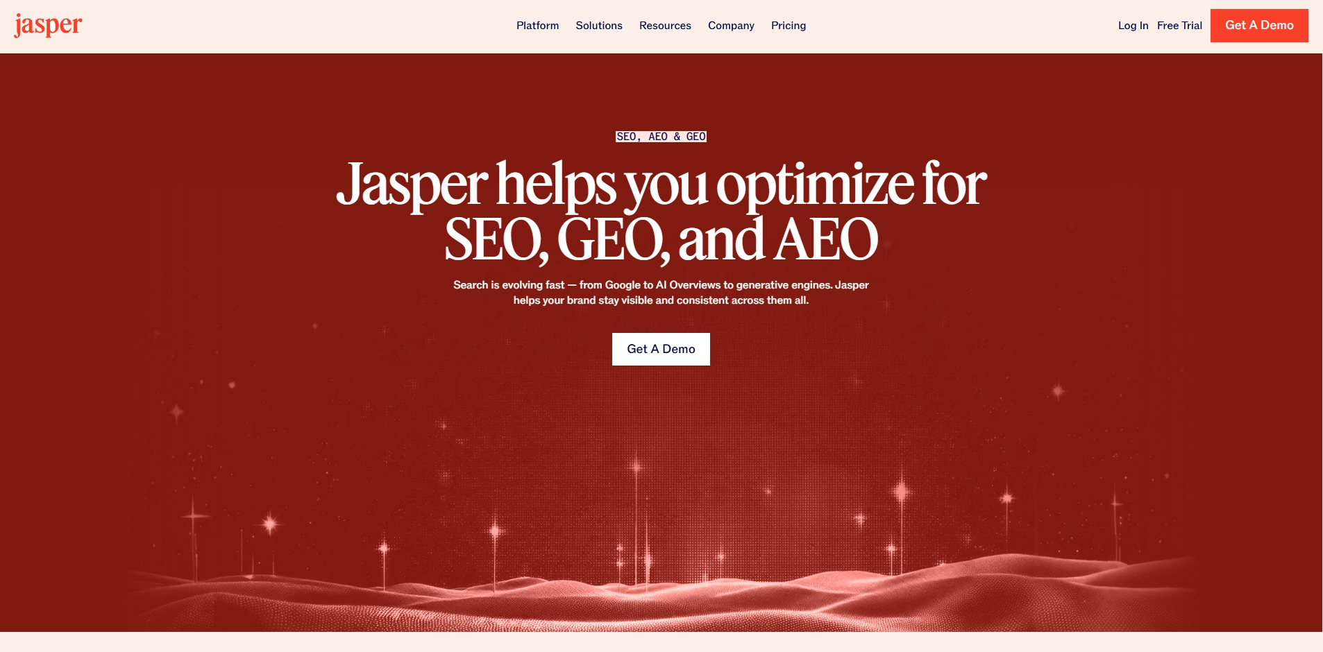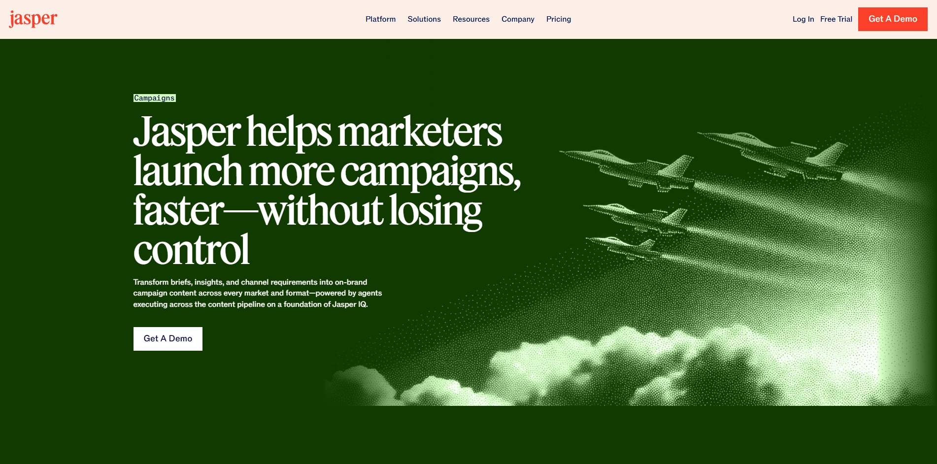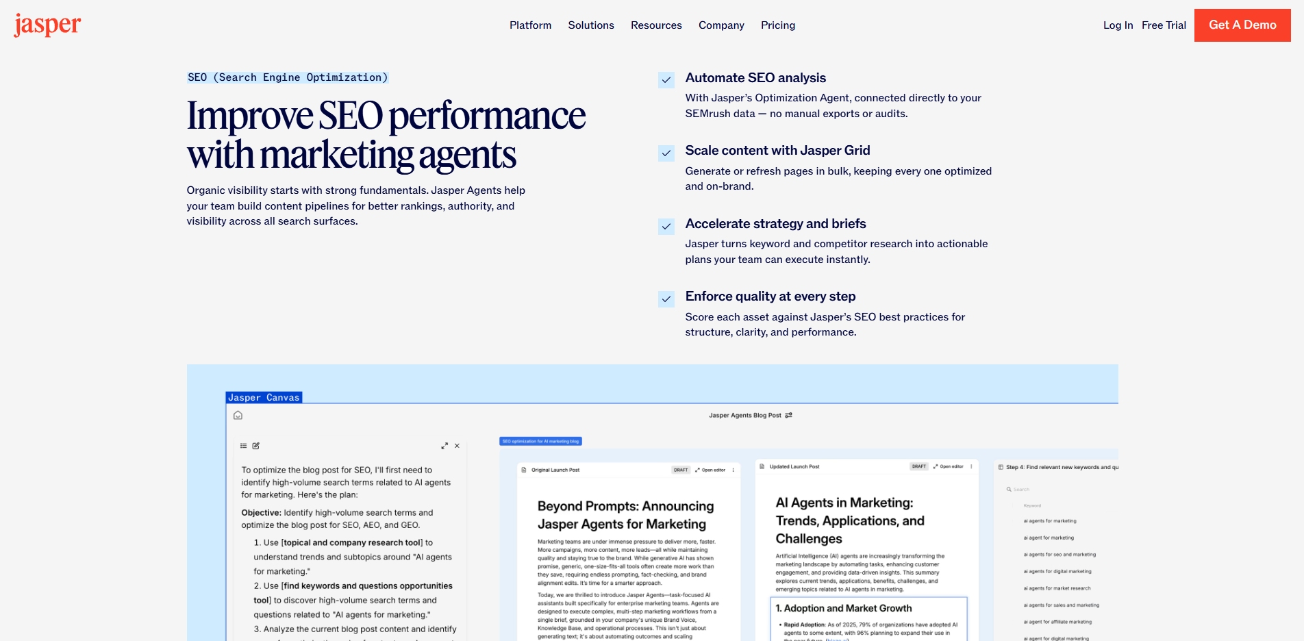 Jasper AI is a marketing platform with 50+ content templates, brand voice training, AI agents, campaign workflows, and SEO tools for marketing teams