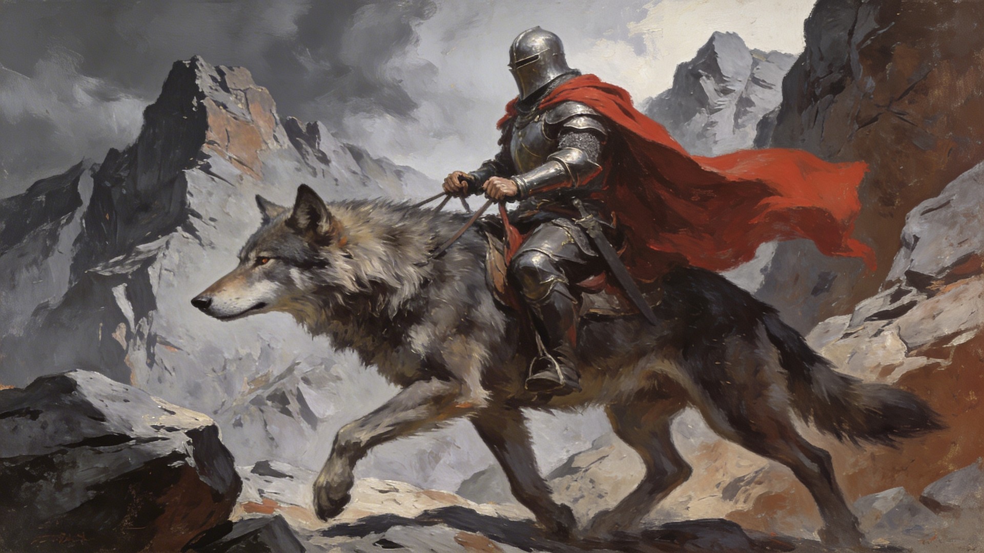 In the style of an oil painting. A powerful knight in full armor with a flowing red cloak riding a giant wolf through a dramatic grey and brown rocky mountain landscape. The wolf walks with its body moving from right to left, with the wolf’s nose pointing toward the left edge of the image. The knight holds the reins with both hands. Jagged rocks and cliffs surround them. The full body and head of both the knight and the wolf must be fully visible and not cropped