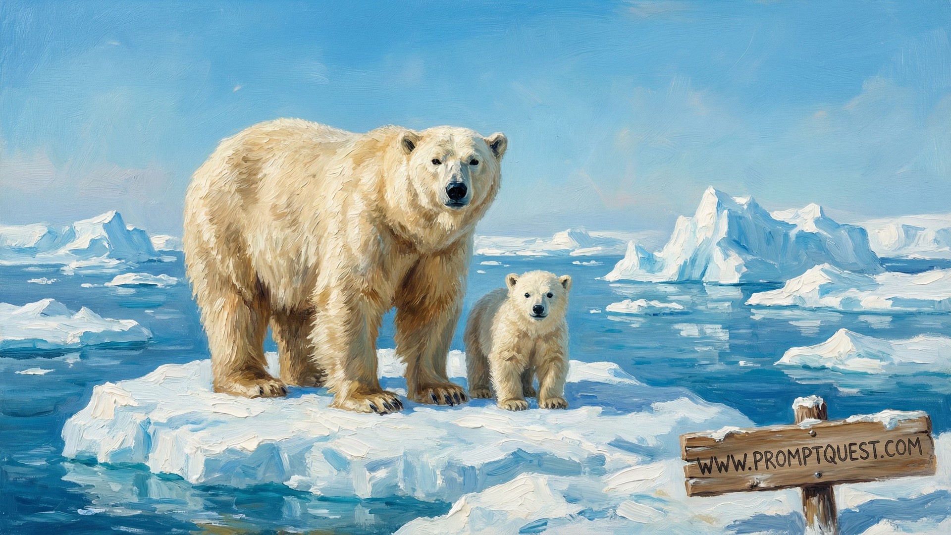 In the style of an oil painting. A large polar bear and her small cub standing side by side on a floating ice floe in the Arctic ocean, both fully visible and facing the camera. Icebergs and icy water stretch into the distance behind them under a bright clear Arctic blue sky