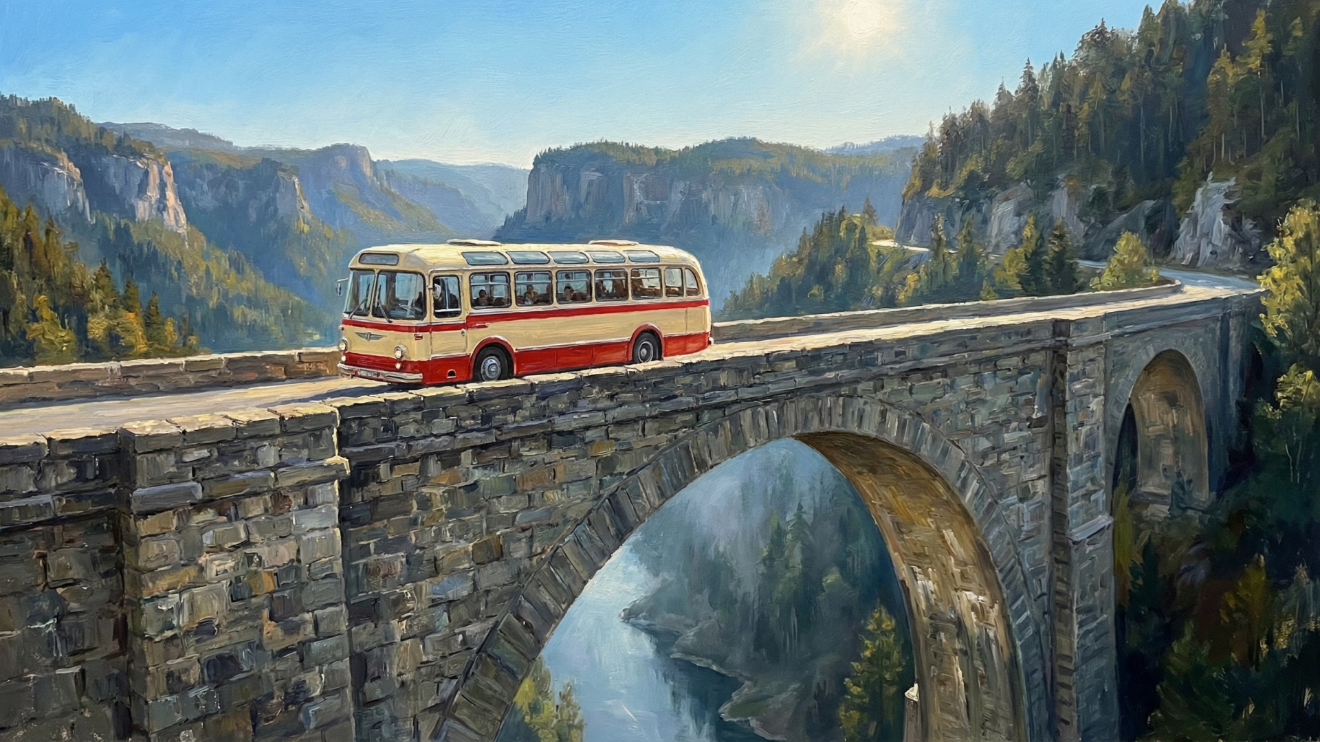 In the style of an oil painting. A bus seen from the side crossing a tall arched stone bridge spanning a dramatic gorge. The bus is driving across the bridge from left to right. The bridge is made of ancient grey stone with a large arch. Far below the bridge is a deep misty river valley. Forested mountains and cliffs rise in the distance. The scene shows the full bus and bridge clearly. Clear blue sky with the sun fully visible in the distance