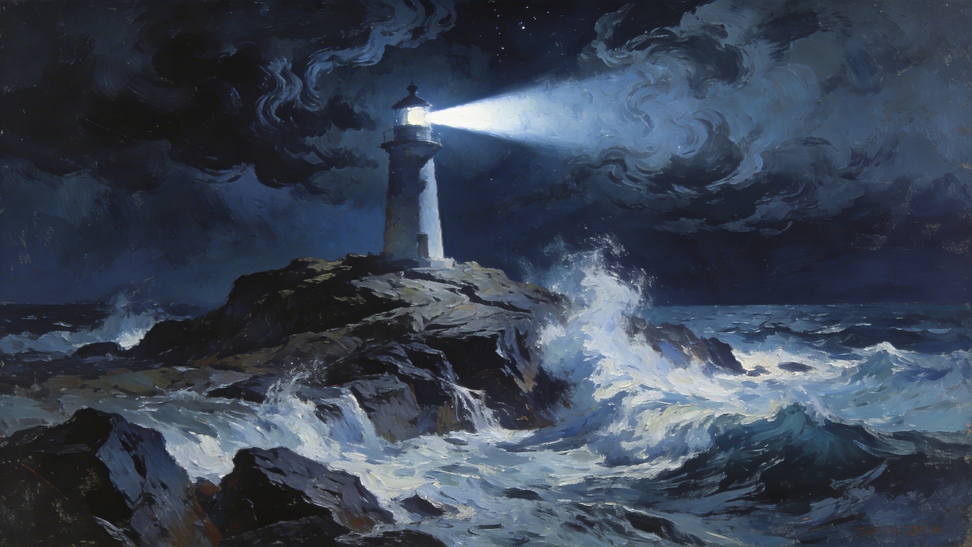In the style of an oil painting. A solitary lighthouse standing on a rocky island at night, waves crashing violently against the rocks below. Dark stormy clouds fill the sky above. The lighthouse beam cuts through the darkness