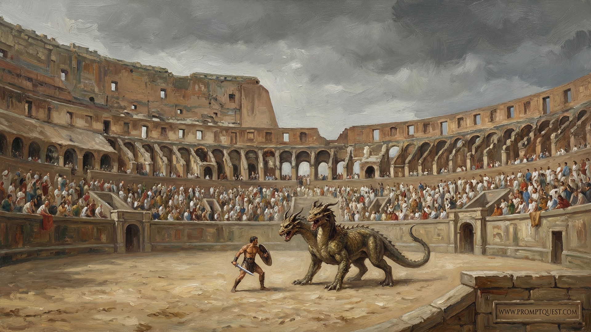 In the style of an oil painting. A vast ancient outdoors Roman colosseum arena with a gladiator warrior fighting a massive two-headed monster in the center. Crowds of spectators in traditional Roman tunics and togas seated in the grandstands surrounding the arena. There are no people on the arena floor. Dark dramatic, overcast sky above
