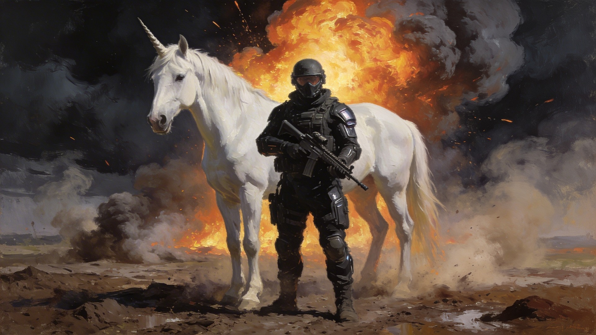 In the style of an oil painting. A lone soldier in black futuristic combat gear holding a machine gun, standing centered in the frame in an open muddy warzone. A clean white unicorn stands calmly beside him. Thick smoke and dust fill the air around them. A large explosion erupts directly behind him with fire rising into a dark dramatic smoky sky. The soldier faces the camera