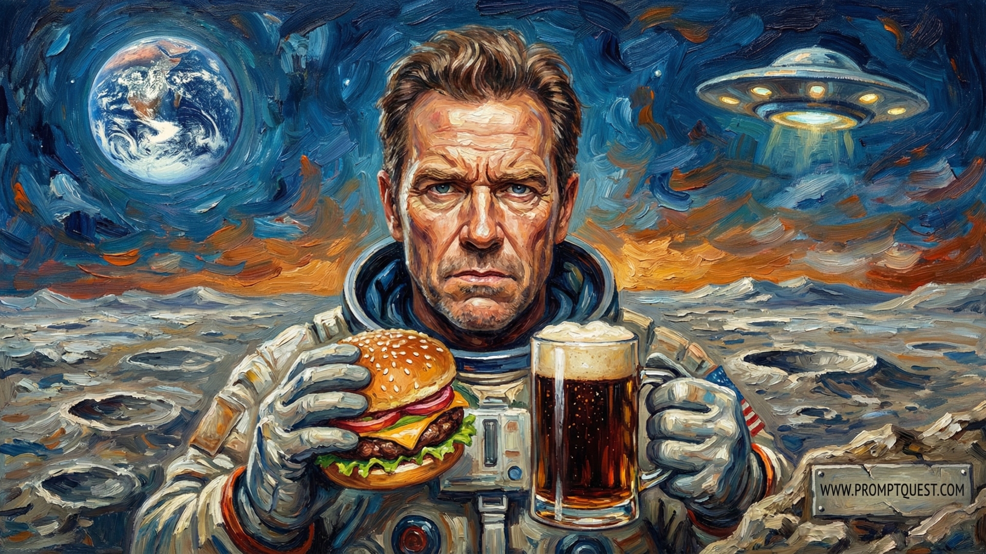 In the style of an oil painting. A portrait of a middle aged man in his 40s with a serious and intense expression, looking directly into the camera, holding a hamburger in one hand and a large glass mug of foaming beer in the other. Full head and shoulders centered in the frame. Standing on the moon, surrounded by a dramatic rocky lunar landscape stretching out in all directions, Earth visible in the sky on the left side and an alien spaceship hovering in the sky on the right side