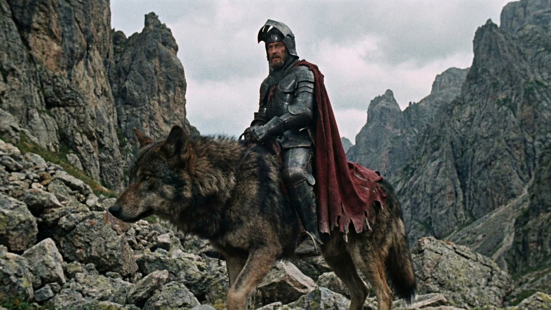 In the style of a 1970s soviet cinematography, no vignette, no HD, no digital render. A powerful knight in full armor with the helmet open and a flowing cloak riding a giant wolf through a dramatic grey and brown rocky mountain landscape. The wolf walks with its body moving from right to left, with the wolf’s nose pointing toward the left edge of the image. Jagged rocks and cliffs surround them. The full body and head of both the knight and the wolf must be fully visible and not cropped