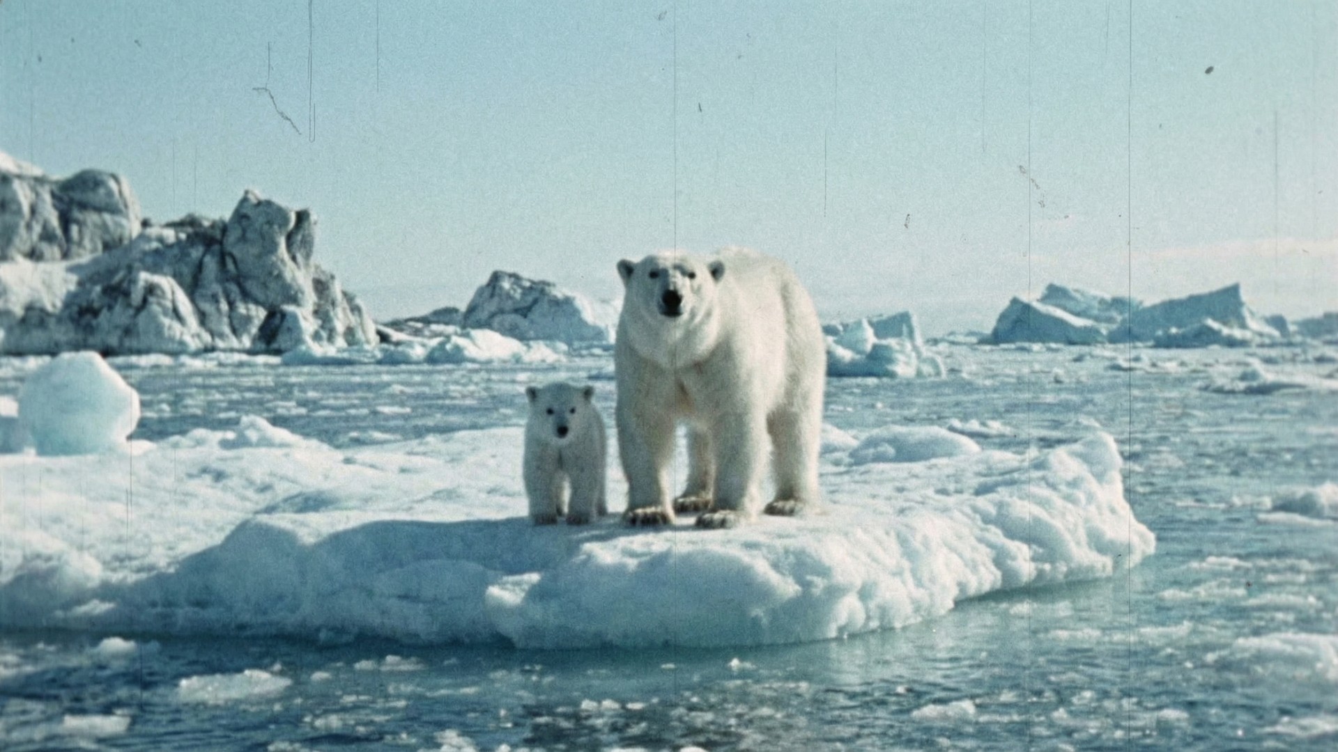 In the style of a 1970s soviet cinematography, no vignette, no HD, no digital render. A large polar bear and her small cub standing side by side on a floating ice floe in the Arctic ocean, both fully visible and facing the camera. Icebergs and icy water stretch into the distance behind them under a bright clear Arctic blue sky