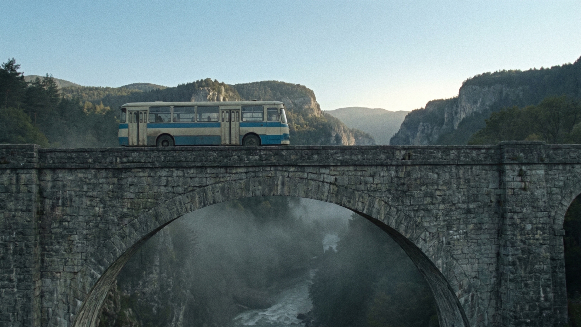 In the style of a 1970s soviet cinematography, no vignette, no HD, no digital render. A bus seen from the side crossing a tall arched stone bridge spanning a dramatic gorge. The bus is driving across the bridge from left to right. The bridge is made of ancient grey stone with a large arch. Far below the bridge is a deep misty river valley. Forested mountains and cliffs rise in the distance. The scene shows the full bus and bridge clearly. Clear blue sky with the sun fully visible in the distance