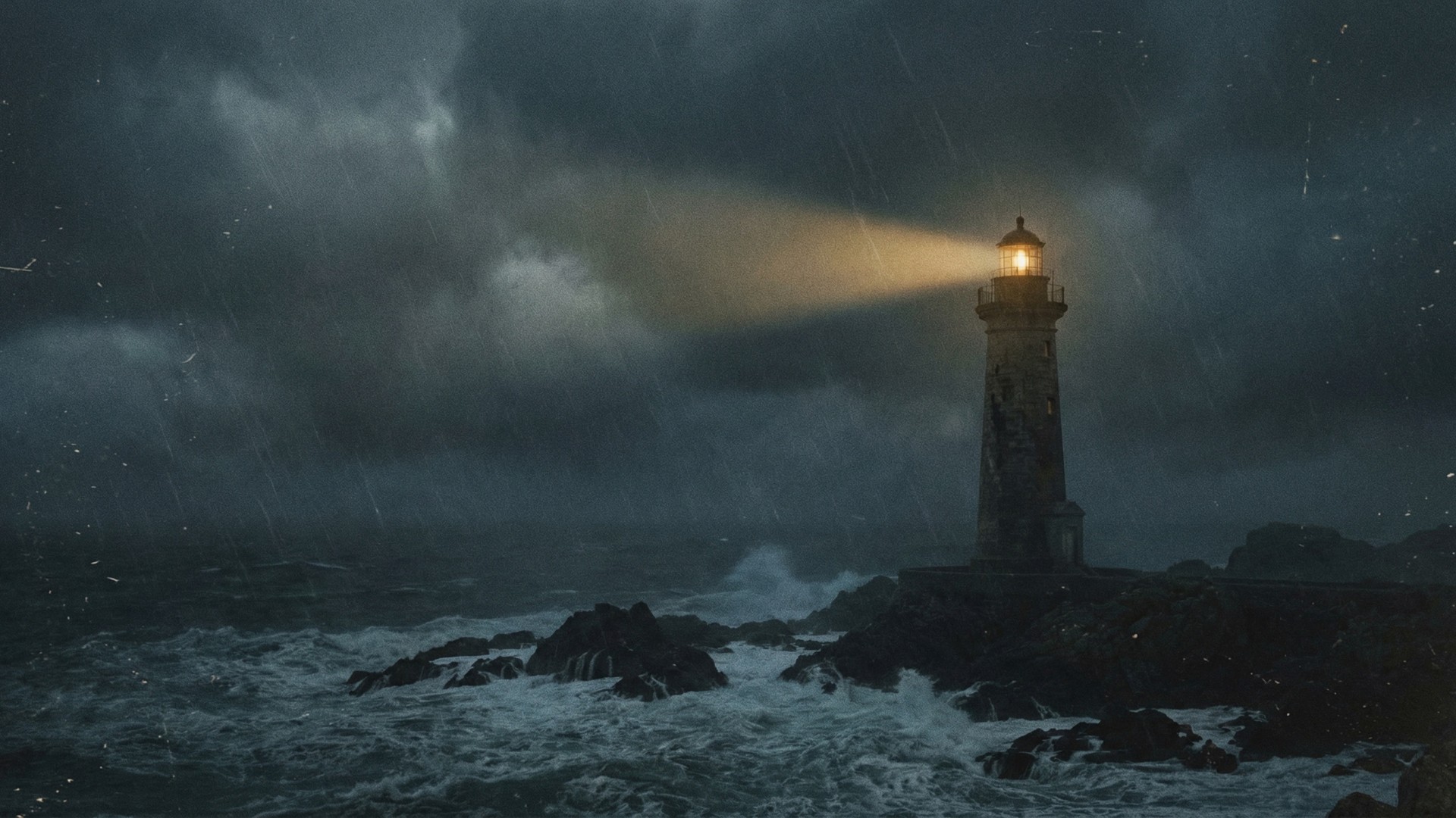 In the style of a 1970s soviet cinematography, no vignette, no HD, no digital render. A solitary lighthouse standing on a rocky island at night, waves crashing violently against the rocks below. Dark stormy clouds fill the sky above. The lighthouse beam cuts through the darkness