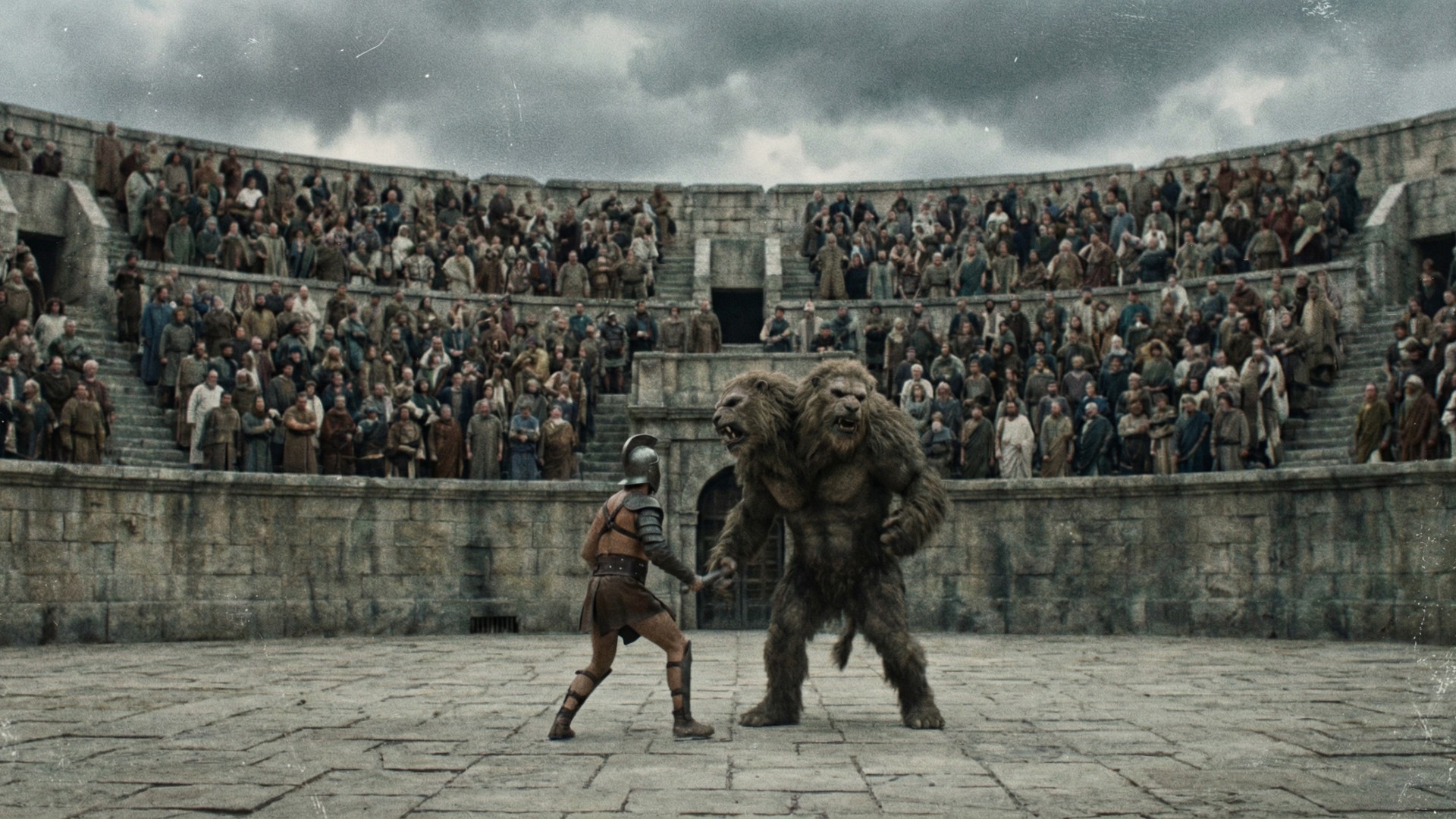 In the style of a 1970s soviet cinematography, no vignette, no HD, no digital render. A vast ancient outdoors Roman colosseum arena with a gladiator warrior fighting a massive two-headed monster in the center. Crowds of spectators in traditional Roman tunics and togas seated in the grandstands surrounding the arena. There are no people on the arena floor. Dark dramatic, overcast sky above