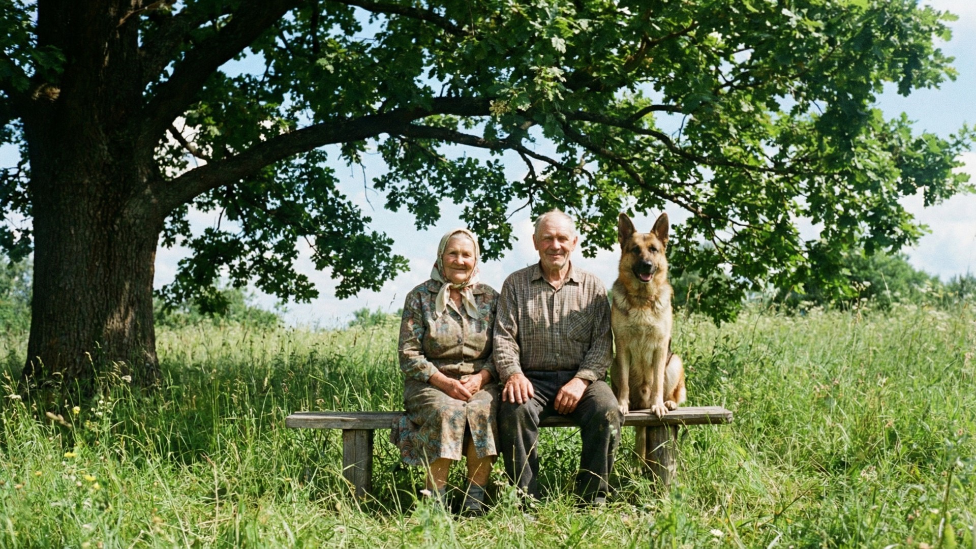 In the style of a 1970s soviet cinematography, no vignette, no HD, no digital render. An elderly couple in their 80s sitting closely together on an old wooden bench in a lush green summer field on a bright sunny day. A German Shepherd dog sits upright on the bench beside them. They are sitting under the wide spreading canopy of a large oak tree in full summer leaf, with thick green foliage overhead and blue sky visible through the branches. Both facing the camera