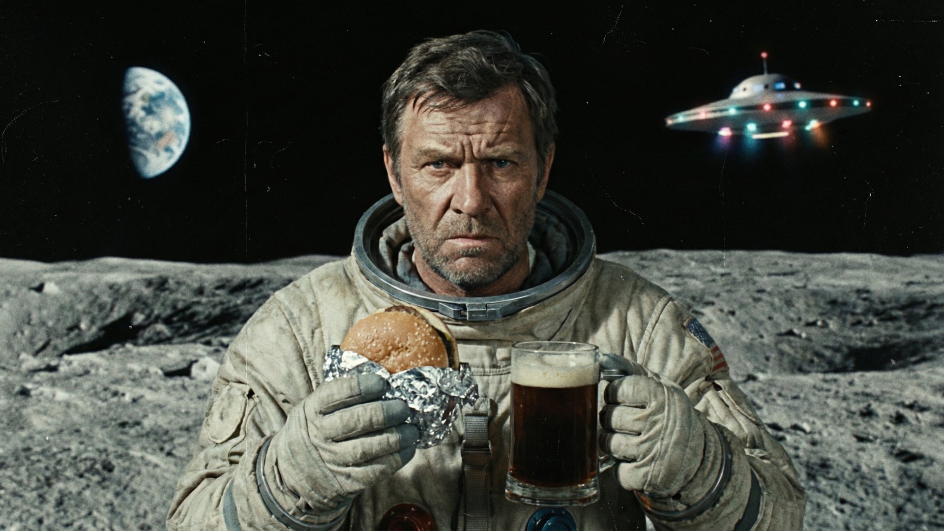 In the style of a 1970s soviet cinematography, no vignette, no HD, no digital render. A portrait of a middle aged man in his 40s with a serious and intense expression, looking directly into the camera, holding a hamburger in one hand and a large glass mug of foaming beer in the other. Full head and shoulders centered in the frame. Standing on the moon, surrounded by a dramatic rocky lunar landscape stretching out in all directions, Earth visible in the sky on the left side and an alien spaceship hovering in the sky on the right side.