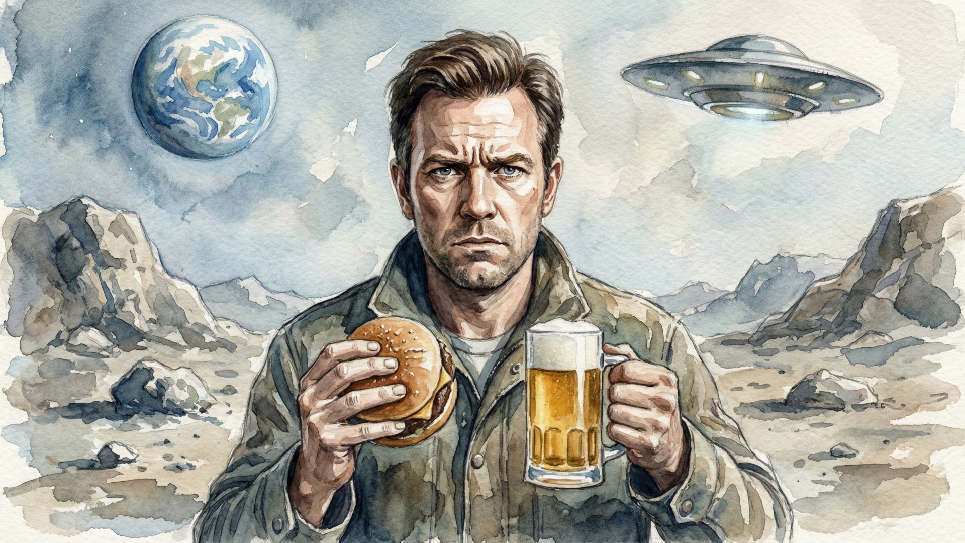 In the style of a watercolor painting. A portrait of a middle aged man in his 40s with a serious and intense expression, looking directly into the camera, holding a hamburger in one hand and a large glass mug of foaming beer in the other. Full head and shoulders centered in the frame. Standing on the moon, surrounded by a dramatic rocky lunar landscape stretching out in all directions, Earth visible in the sky on the left side and an alien spaceship hovering in the sky on the right side