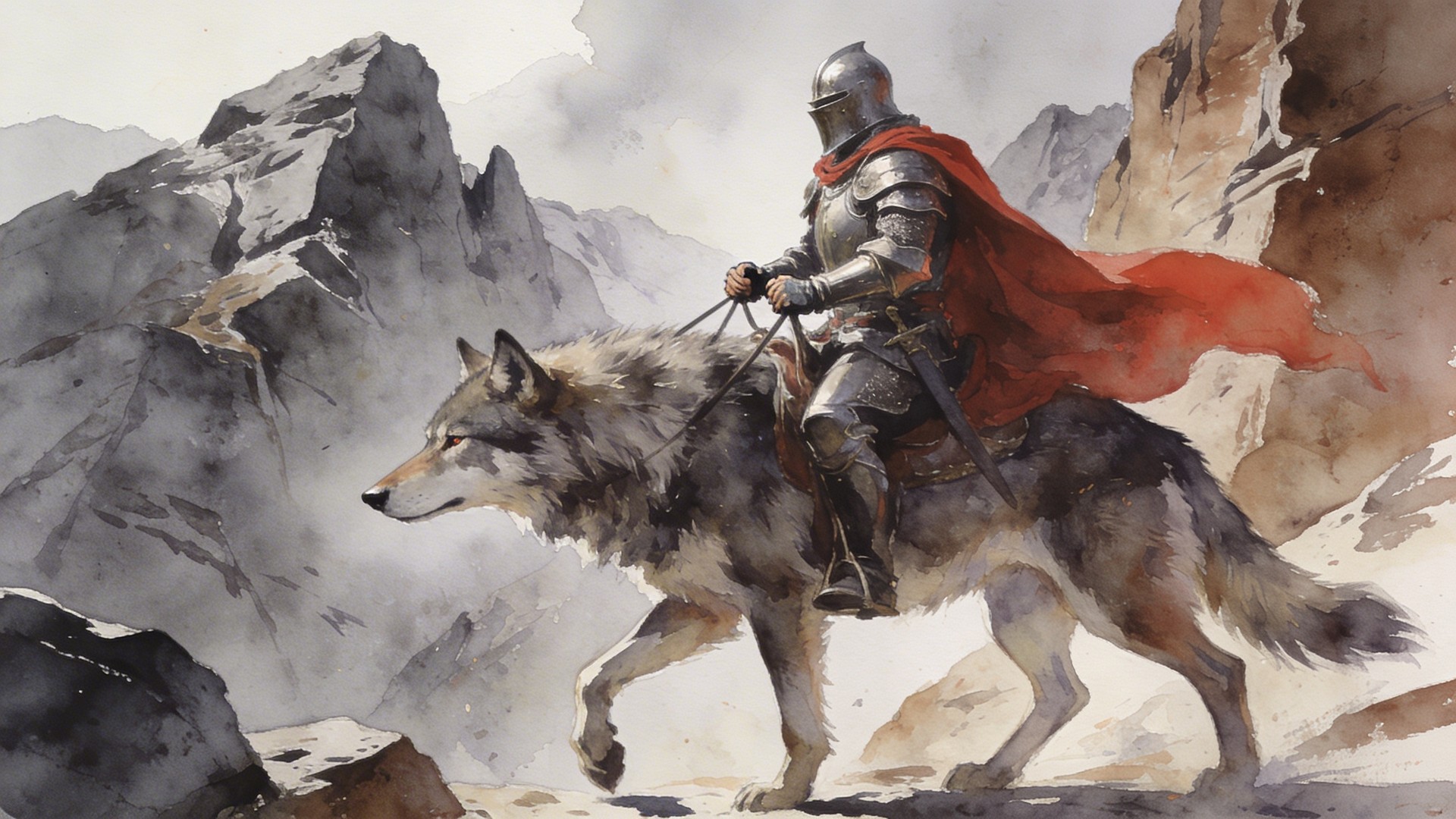 In the style of a watercolor painting. A powerful knight in full armor with a flowing red cloak riding a giant wolf through a dramatic grey and brown rocky mountain landscape. The wolf walks with its body moving from right to left, with the wolf’s nose pointing toward the left edge of the image. The knight holds the reins with both hands. Jagged rocks and cliffs surround them. The full body and head of both the knight and the wolf must be fully visible and not cropped